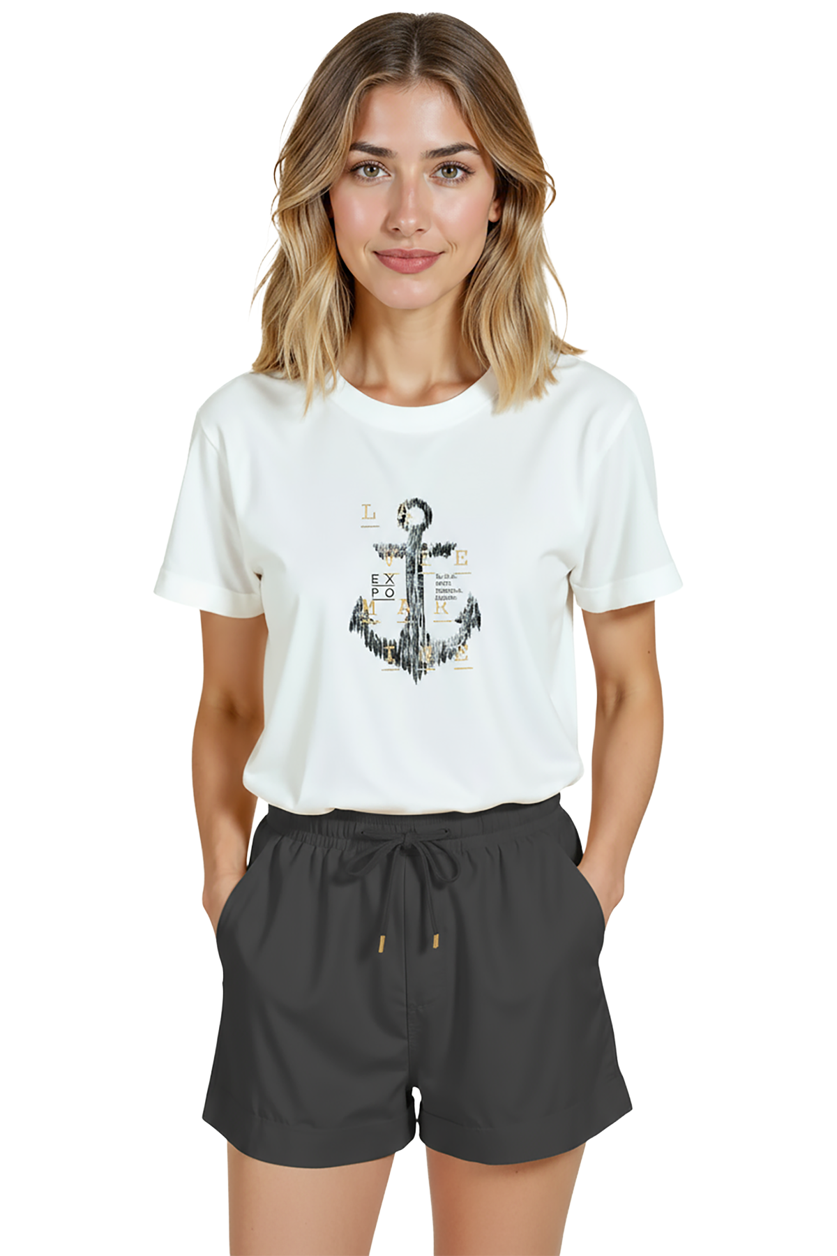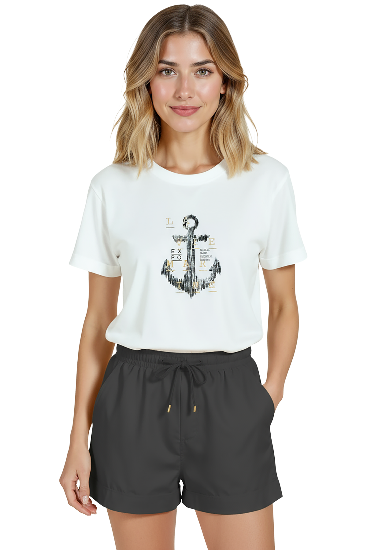 Minimal ve deniz esintili bir tasarım sunan kadın tişörtü. Bu beyaz relaxed fit kadın tişört, ön göğüste yer alan suluboya dokulu çapa illüstrasyonu ve marin tipografi detayları ile modern ve nostaljik bir görünüm sağlar. Ürün %100 pamuk kumaştan üretilmiş olup relaxed fit kadın kesim sayesinde gün boyu konfor, nefes alabilirlik ve rahat hareket sunar. Grafik yüksek çözünürlüklü dijital baskı ile uygulanmış; suluboya geçişleri ve ince tipografi detayları uzun süre canlı kalır. Günlük şehir kombinleri, tatil‑esintili gardıroplar ve smart‑casual kullanımlar için ideal bir parça.