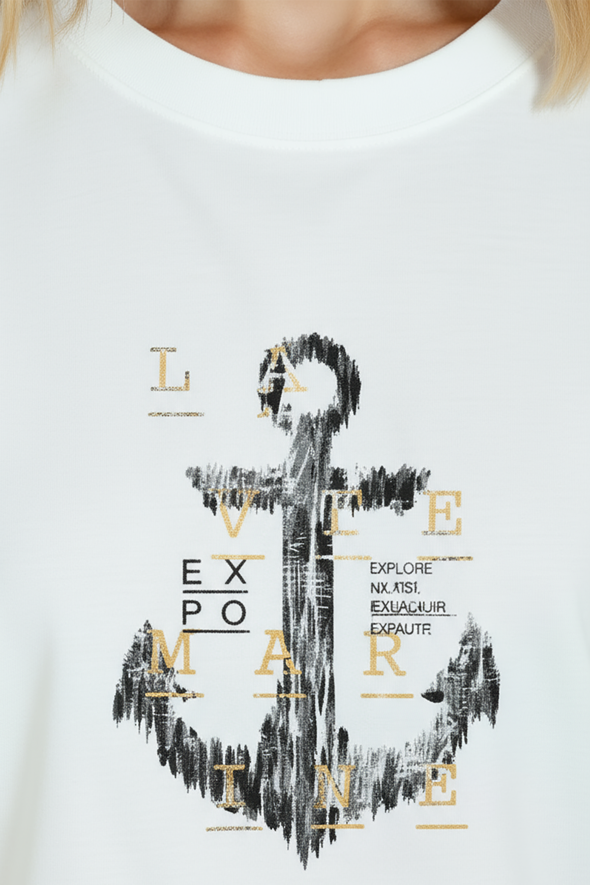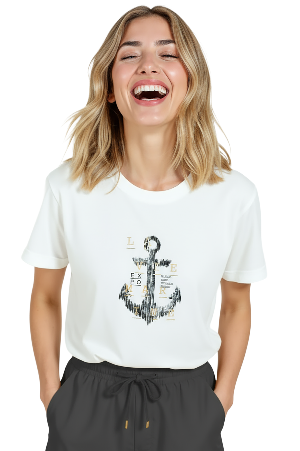Kadın Beyaz Relaxed Fit %100 Pamuk Tişört – Suluboya Çapa & Marin Tipografi Baskılı