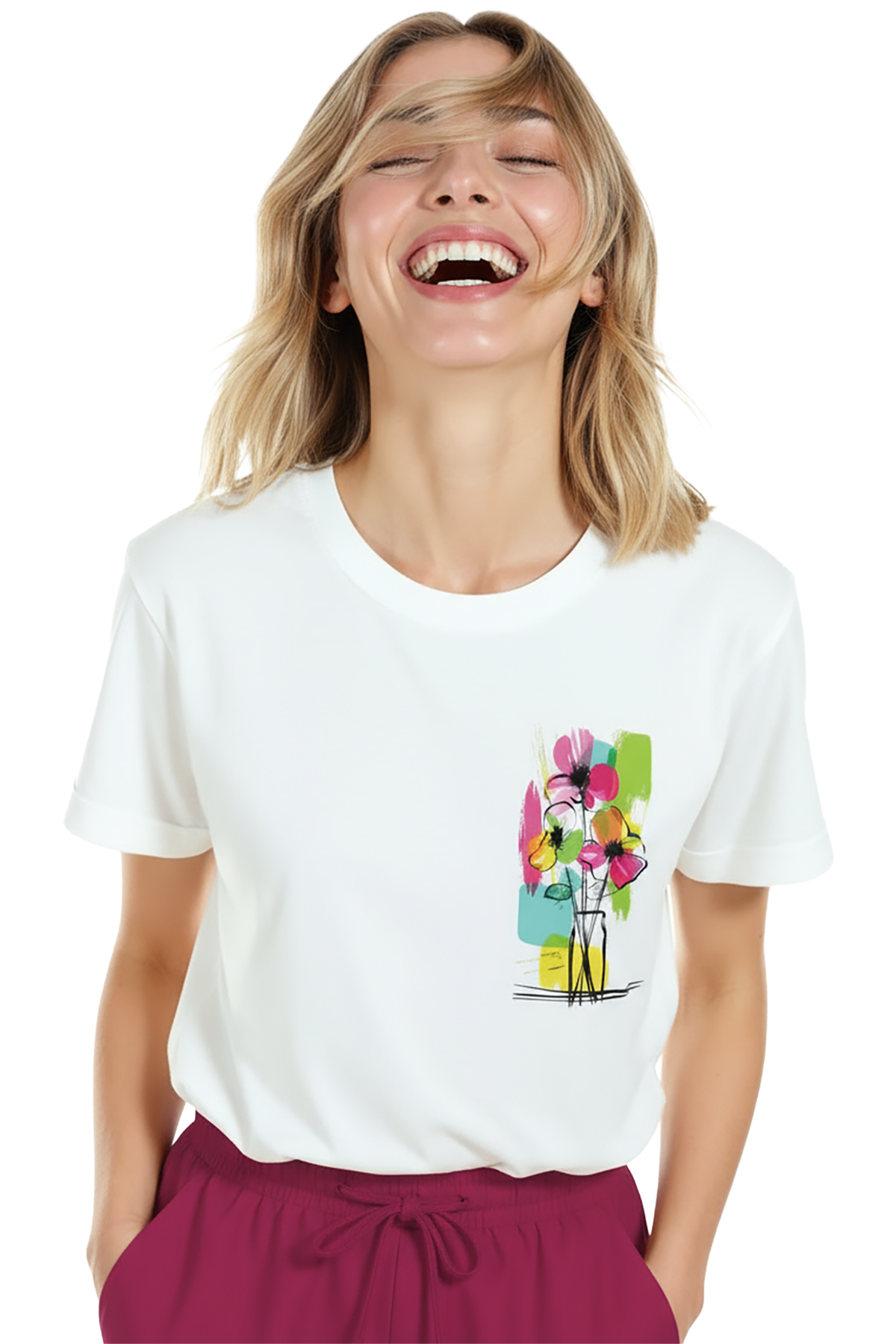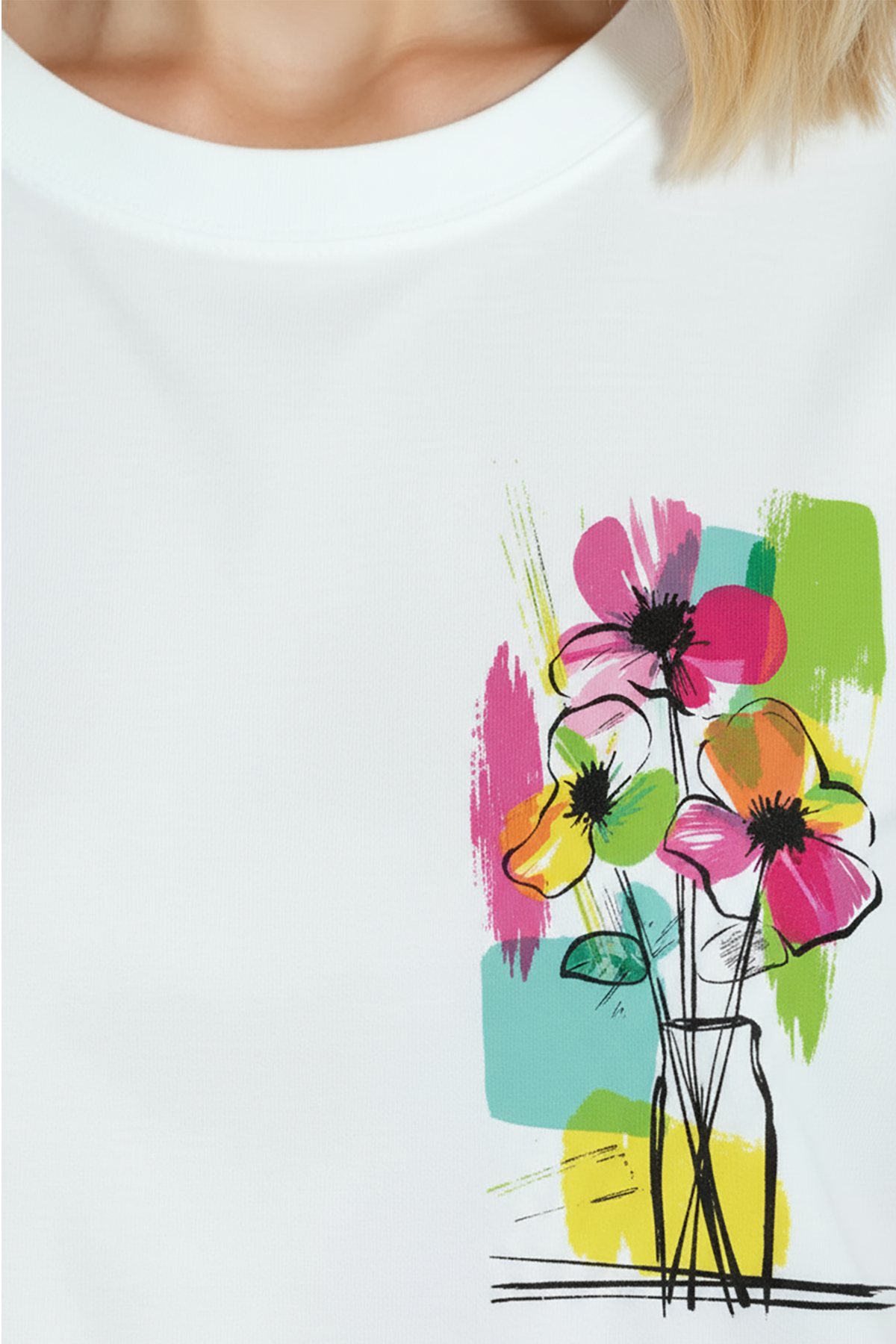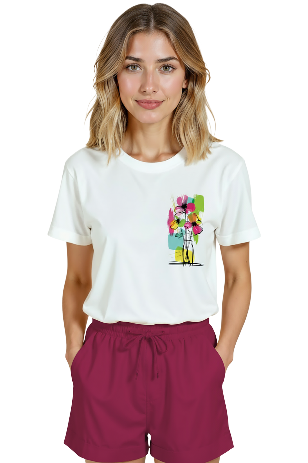 Sanat ve canlı renklerin enerjisini bir arada sunan kadın tişörtü. Bu beyaz relaxed fit kadın tişört, ön göğüste sağ tarafta yer alan renkli suluboya çiçek buketi illüstrasyonu ve ince mürekkep eskiz çizgileriyle hem feminen hem modern bir ifade sunar. Ürün %100 pamuk kumaştan üretilmiştir ve relaxed fit kadın kesim sayesinde gün boyu konfor, nefes alabilirlik ve rahat hareket sağlar. Grafik yüksek çözünürlüklü dijital baskı ile uygulanmış; canlı suluboya geçişleri ve siyah mürekkep çizgiler uzun süre net kalır. Günlük şehir kombinleri, kafe‑stil ve smart‑casual kullanımlar için ideal, minimal ve renkli gardıroplara kolay uyum sağlayan bir parça.