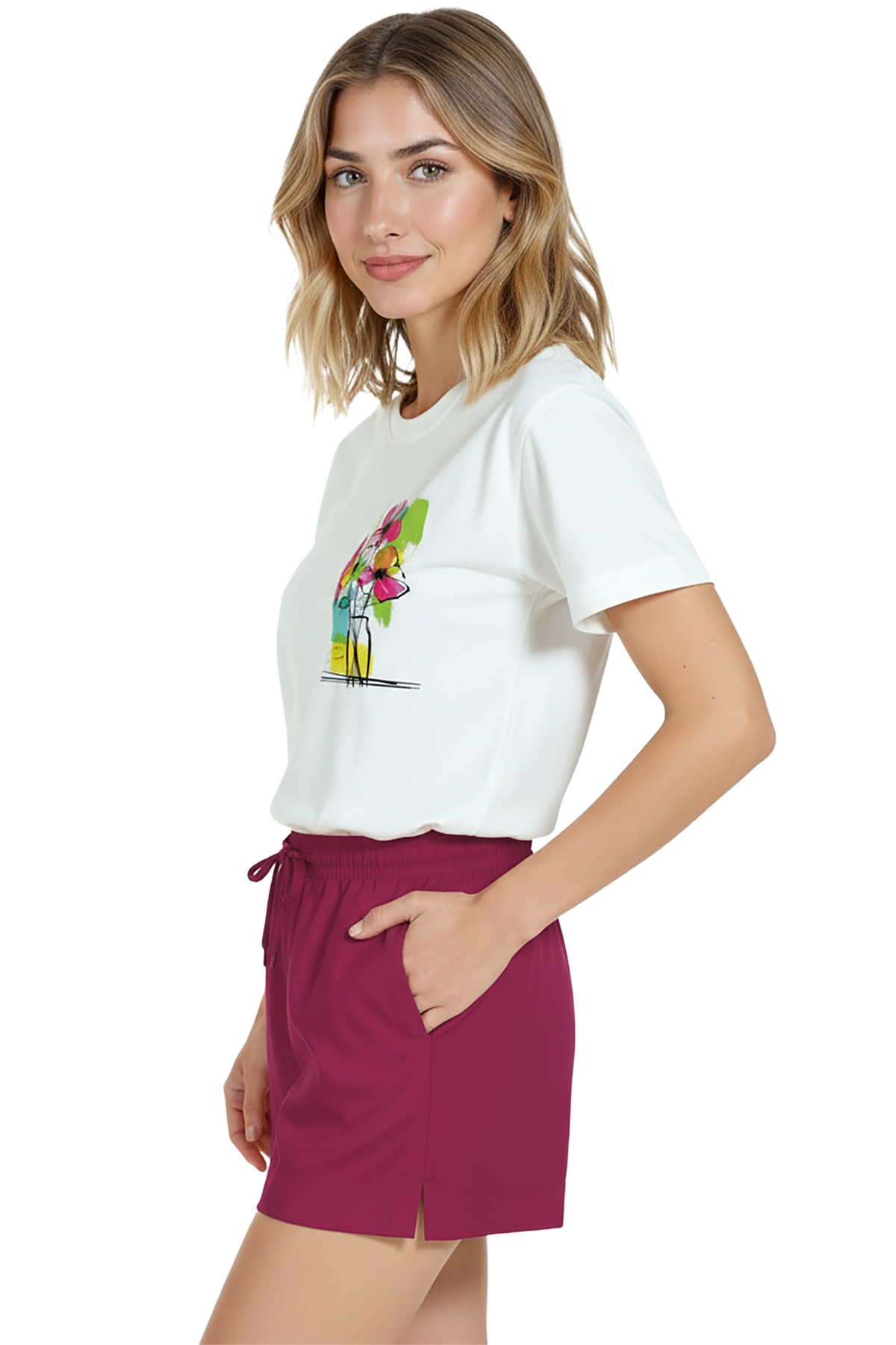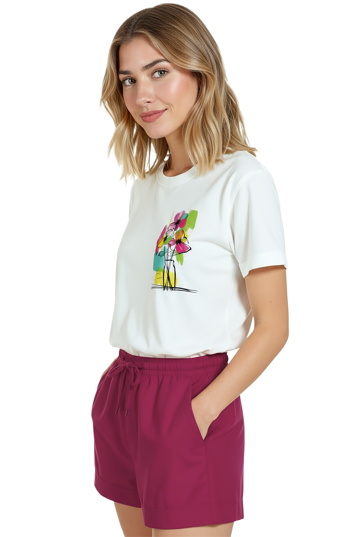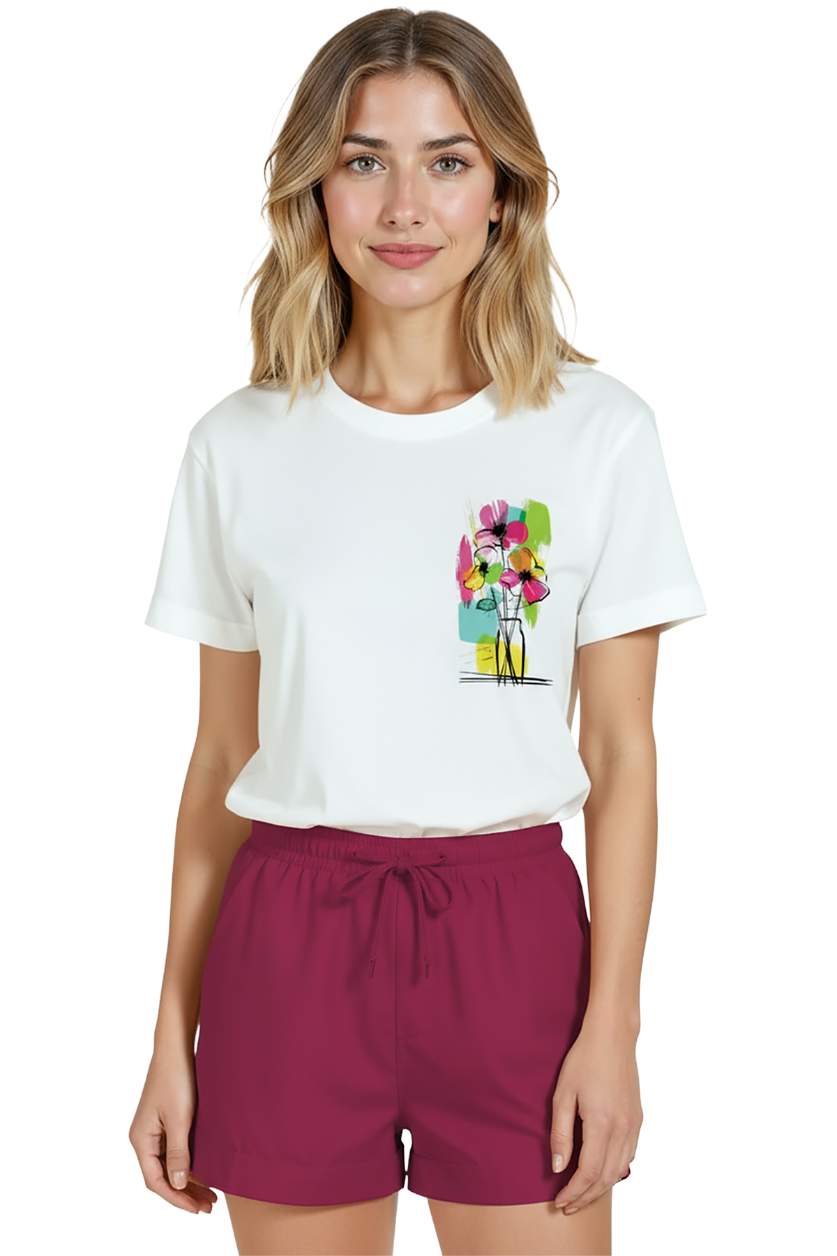 Sanat ve canlı renklerin enerjisini bir arada sunan kadın tişörtü. Bu beyaz relaxed fit kadın tişört, ön göğüste sağ tarafta yer alan renkli suluboya çiçek buketi illüstrasyonu ve ince mürekkep eskiz çizgileriyle hem feminen hem modern bir ifade sunar. Ürün %100 pamuk kumaştan üretilmiştir ve relaxed fit kadın kesim sayesinde gün boyu konfor, nefes alabilirlik ve rahat hareket sağlar. Grafik yüksek çözünürlüklü dijital baskı ile uygulanmış; canlı suluboya geçişleri ve siyah mürekkep çizgiler uzun süre net kalır. Günlük şehir kombinleri, kafe‑stil ve smart‑casual kullanımlar için ideal, minimal ve renkli gardıroplara kolay uyum sağlayan bir parça.