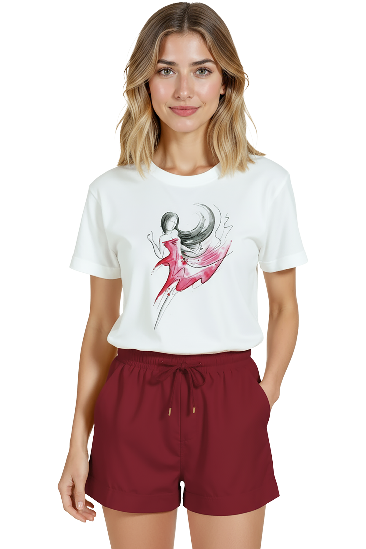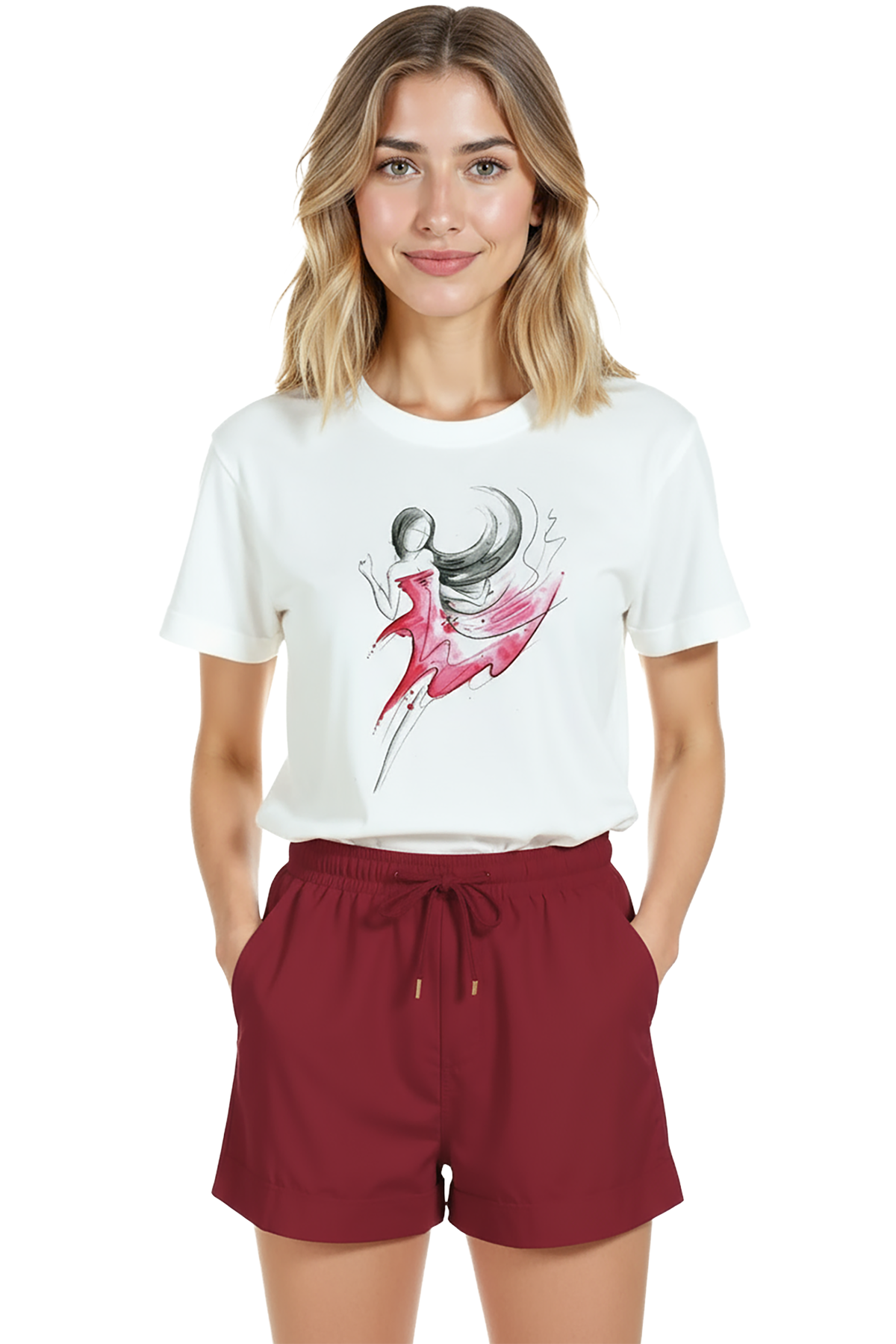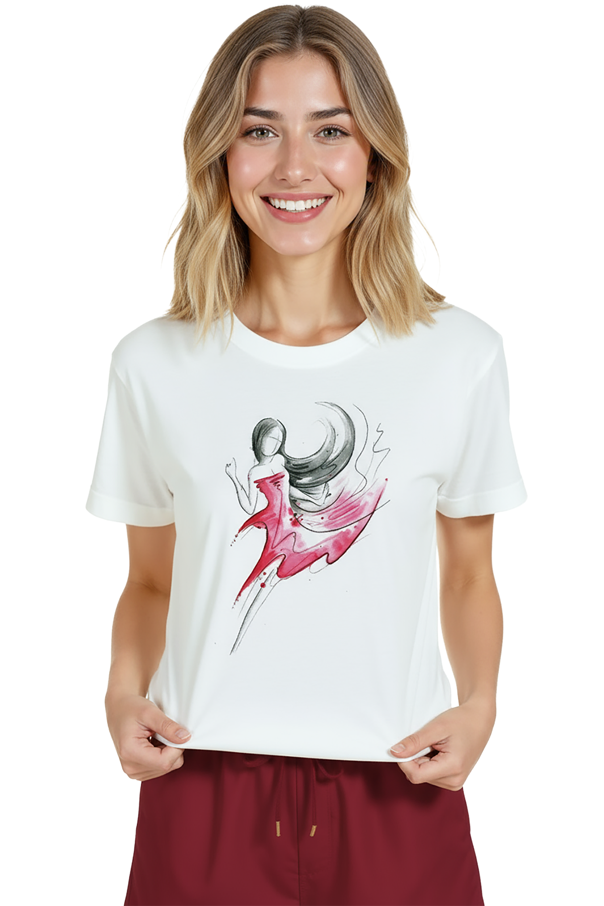 Kadın Beyaz Relaxed Fit %100 Pamuk Tişört – Suluboya Dansçı ve Kırmızı Elbise Baskılı