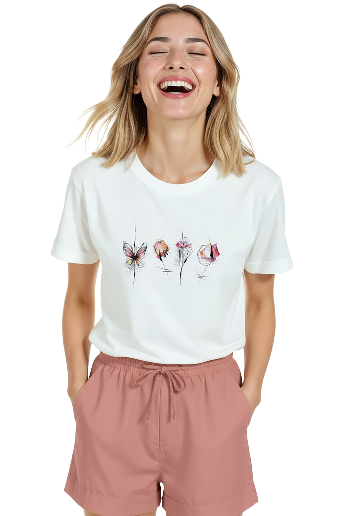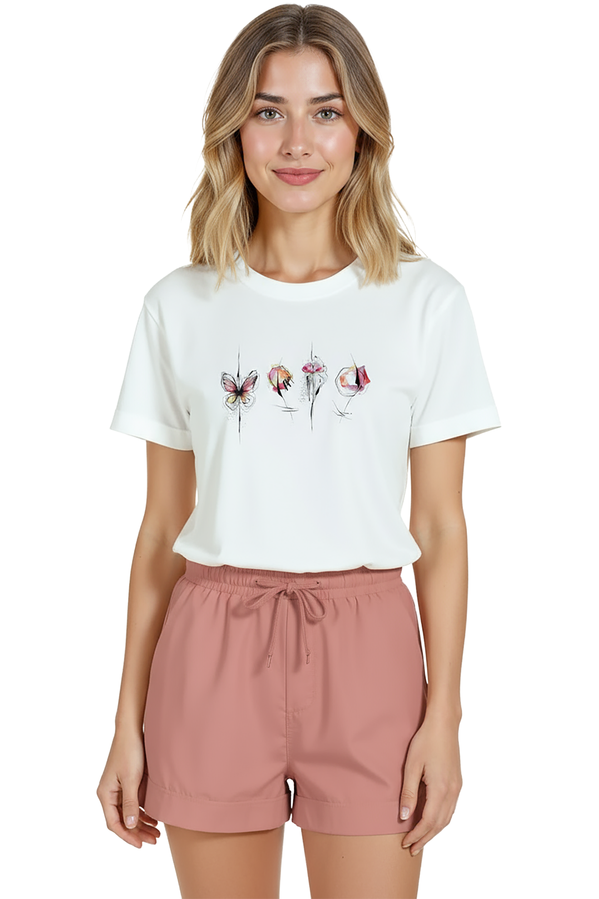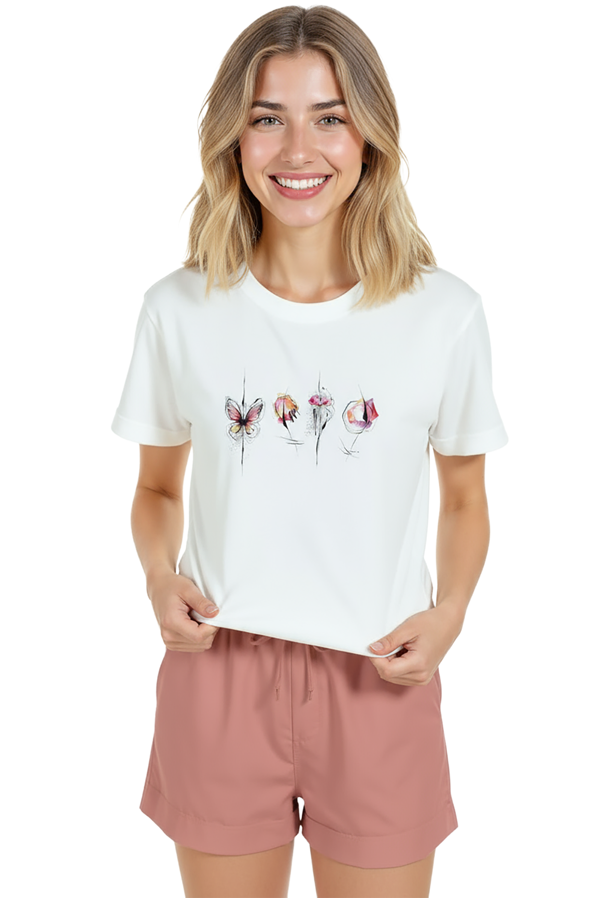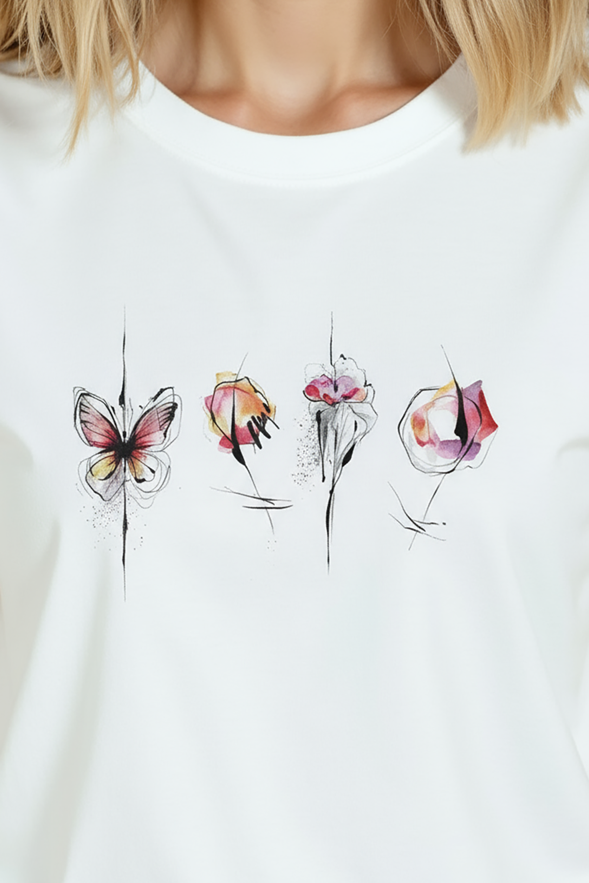 Hafif ve zarif suluboya dokunuşlarıyla tasarlanmış kadın tişörtü. Bu beyaz relaxed fit kadın tişört, ön göğüste yatay sırada yer alan suluboya kelebek ve çiçek kompozisyonu ile hem minimal hem sanatsal bir ifade sunar. Ürün %100 pamuk kumaştan üretilmiş olup relaxed fit kadın kesim sayesinde gün boyu konfor, nefes alabilirlik ve rahat hareket sağlar. İnce mürekkep eskiz çizgileri ile desteklenen renkli suluboya vurgular, günlük şehir kombinleri ve smart‑casual stiller için ideal bir merkez parça oluşturur. Baskı yüksek çözünürlüklü dijital baskı ile uygulanmış; detay ve renk geçişleri uzun süre korunur.