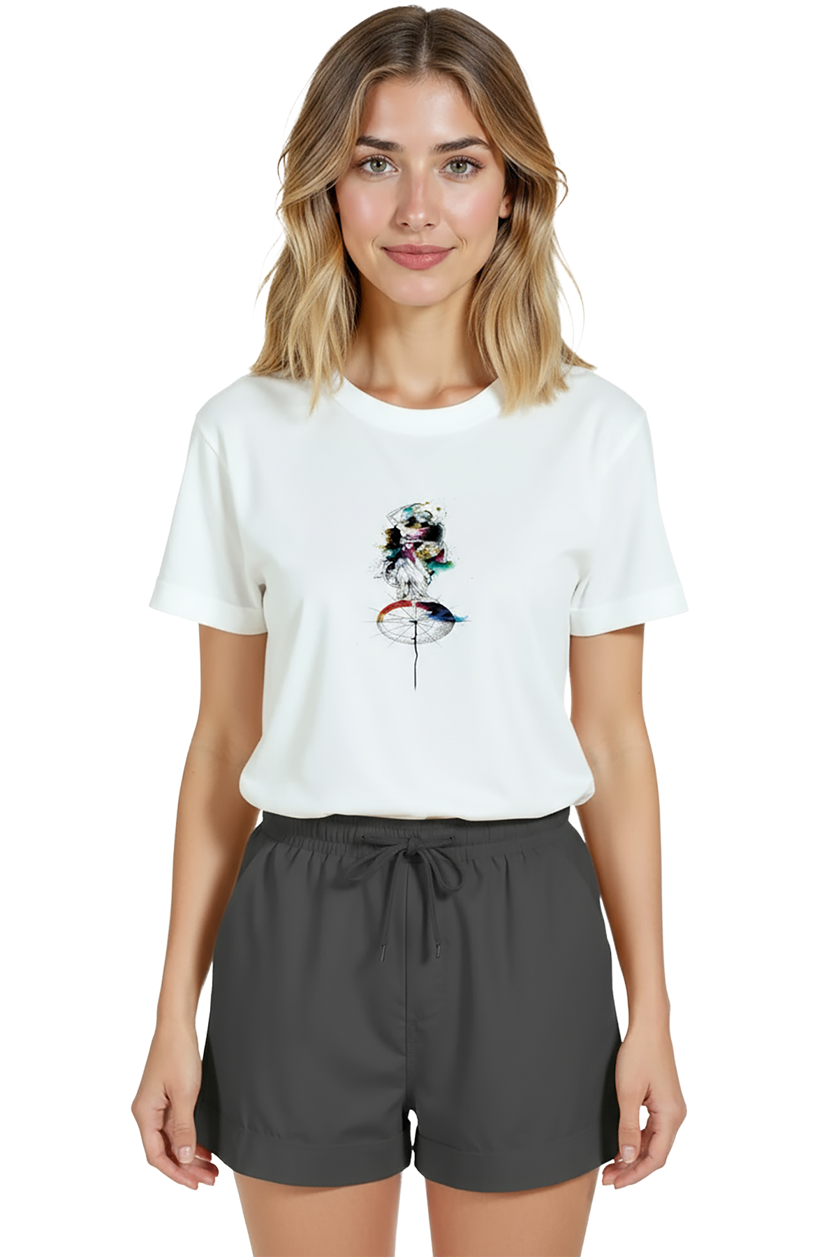 Sanat ve zarafeti bir arada sunan kadın tişörtü. Bu beyaz relaxed fit kadın tişört, ön göğüste yer alan çizgisel mürekkep eskiz ile canlı suluboya dokunuşlarının birleştiği soyut kadın figürü illüstrasyonu ile modern ve dikkat çekici bir görünüm sağlar. Ürün %100 pamuk kumaştan üretilmiş olup relaxed fit kadın kesim sayesinde gün boyu konfor, nefes alabilirlik ve rahat hareket sunar. Baskı yüksek çözünürlüklü dijital baskı ile uygulanmış; ince çizgi detayları ve renk geçişleri uzun süre canlı kalır. Günlük şehir kombinleri, kafe‑stil ve smart‑casual kullanımlar için ideal; sanat‑odaklı gardıroplara güçlü bir ek.