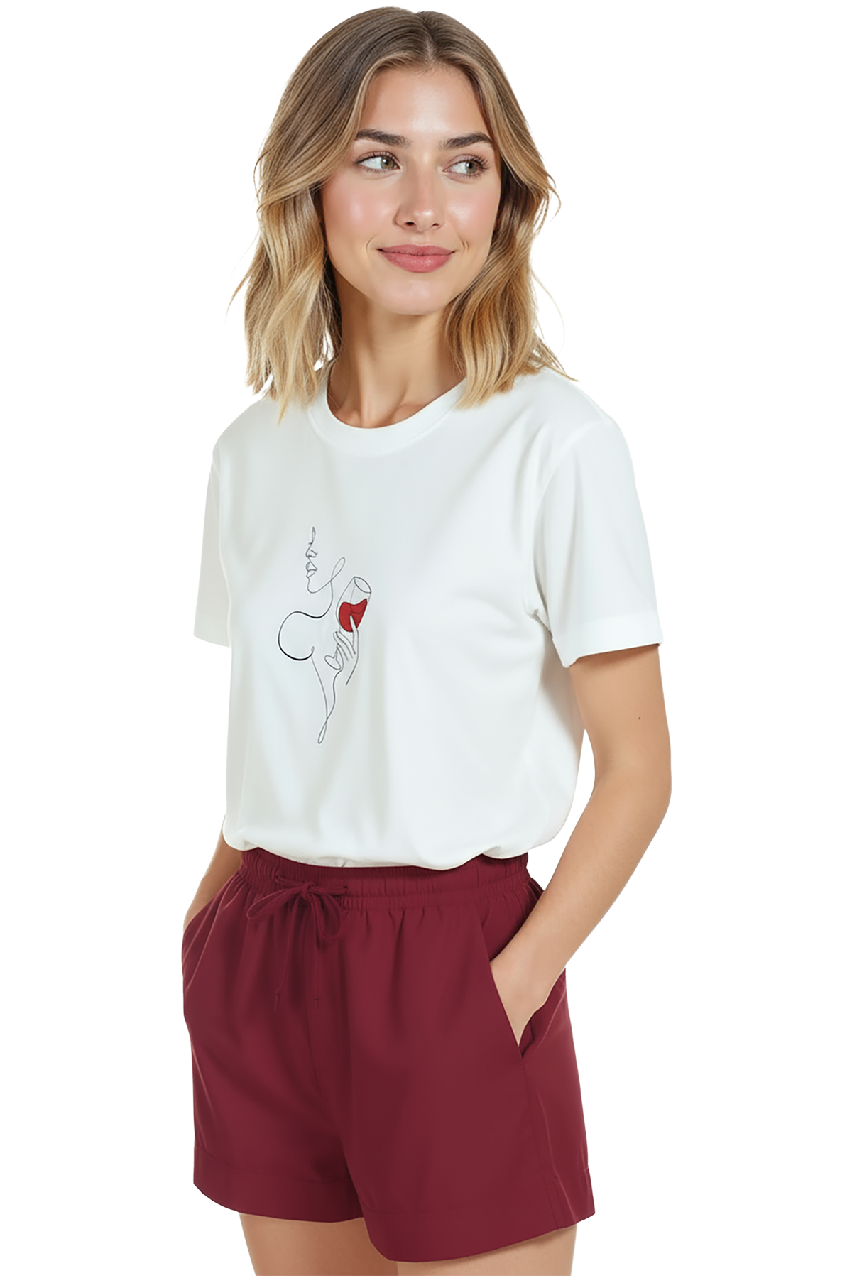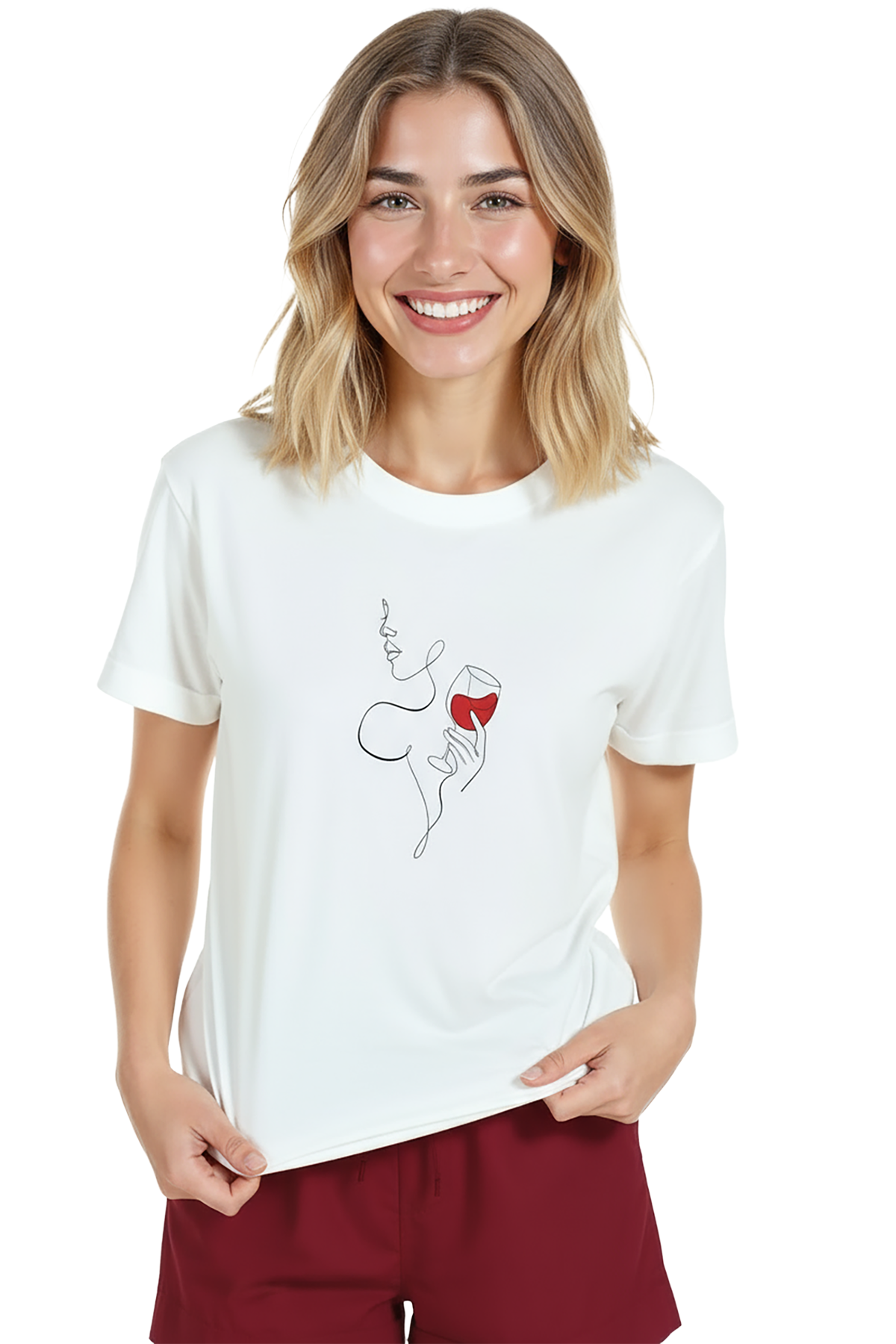 Kadın Beyaz Relaxed Fit %100 Pamuk Tişört – Tek Çizgi Elinde Şarap Kadehi Baskılı