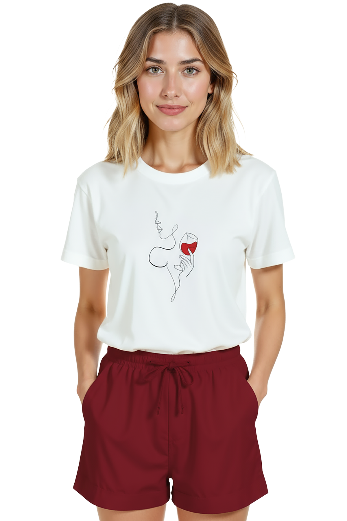 Sanat, minimalizm ve zarafeti bir arada sunan kadın tişörtü. Bu beyaz relaxed fit kadın tişört, ön göğüste yer alan tek çizgi (line‑art) portre illüstrasyonu ve şarap kadehindeki canlı kırmızı dolgu ile sofistike bir ifade sunar. Ürün %100 pamuk kumaştan üretilmiş olup relaxed fit kadın kesim sayesinde gün boyu konfor, nefes alabilirlik ve hareket özgürlüğü sağlar. Baskı göğüs merkezinde, yüksek çözünürlüklü dijital baskı ile uygulanmıştır; ince çizgi detayları ve kırmızı vurgular uzun süre net kalır. Günlük şehir kombinleri, kafe‑stil ve smart‑casual kullanımlar için ideal, minimal gardıroplara şık bir dokunuş katar.