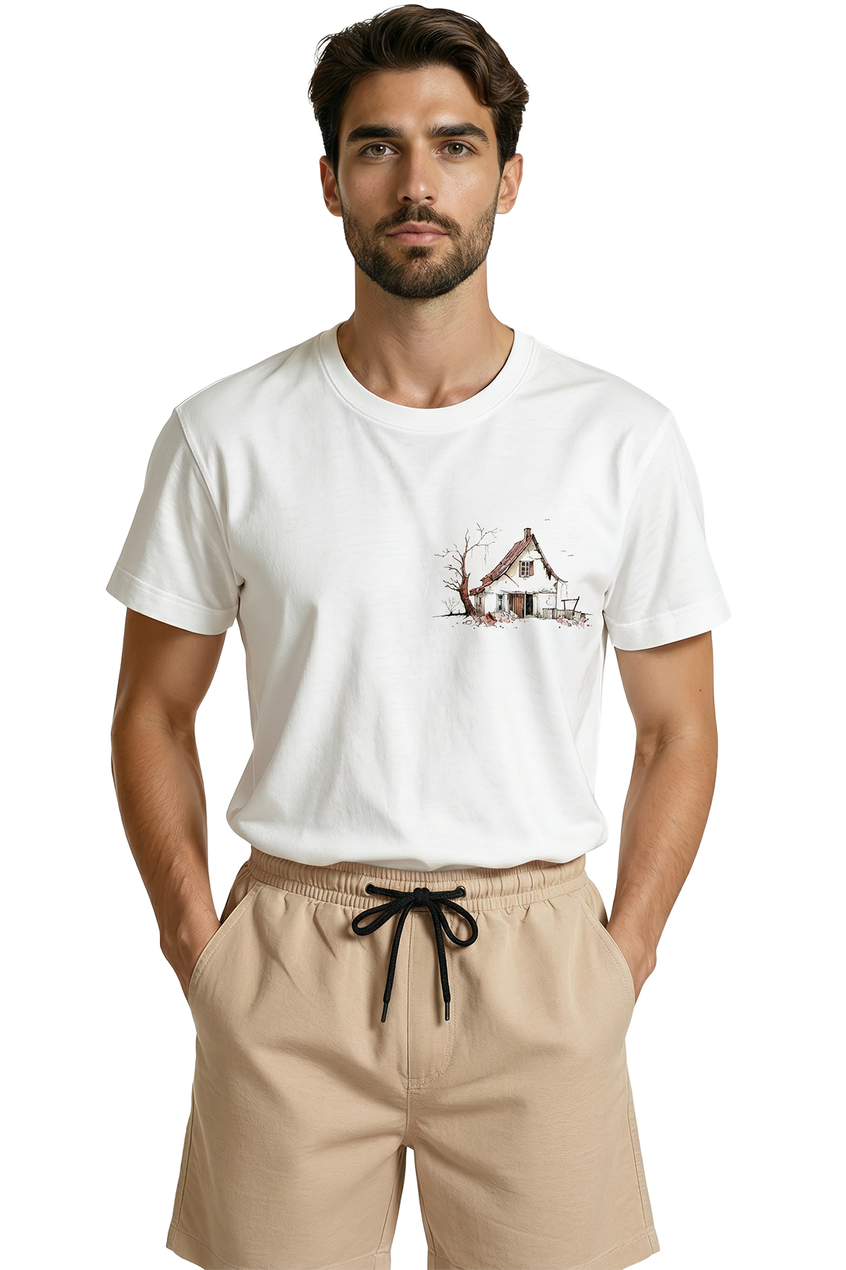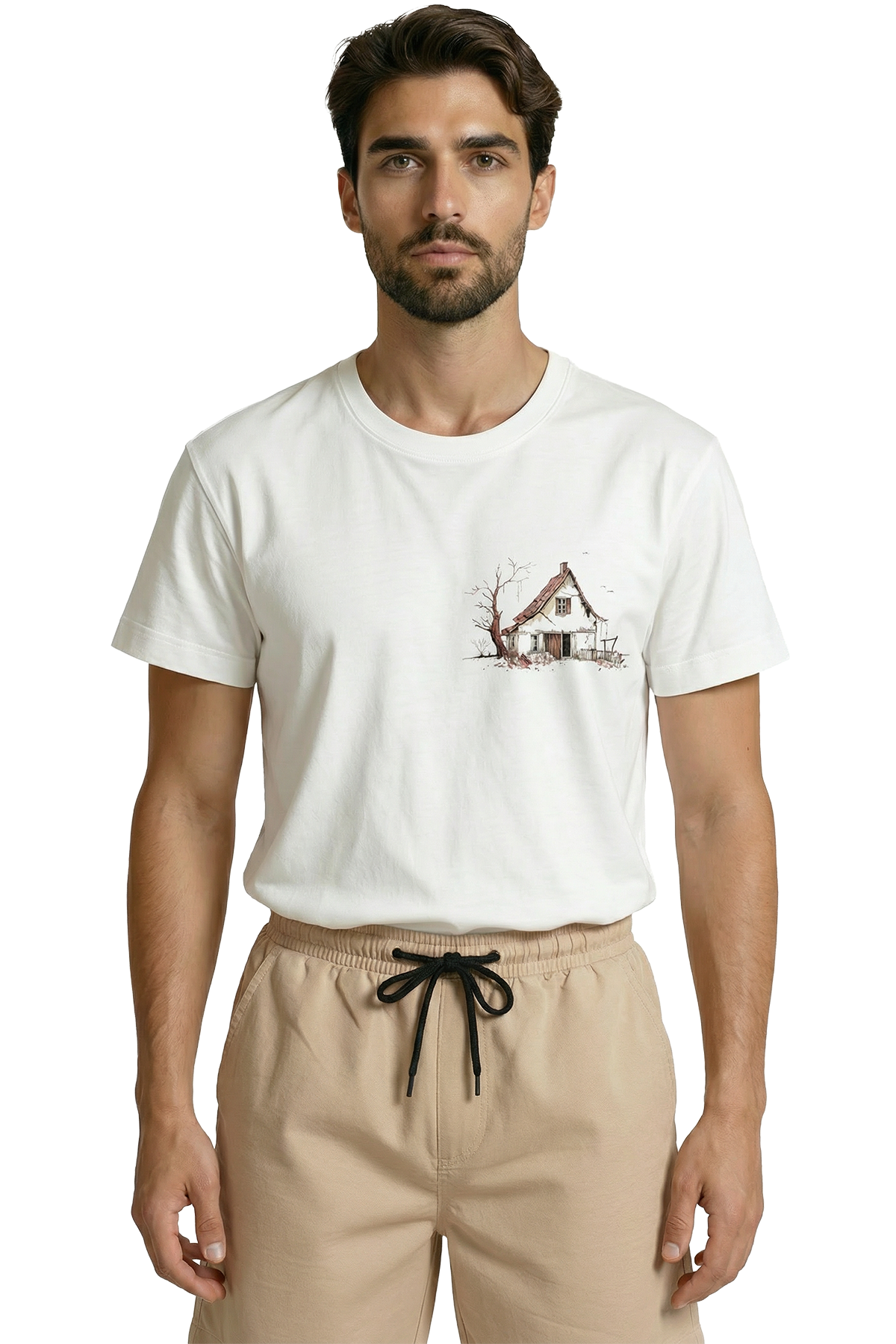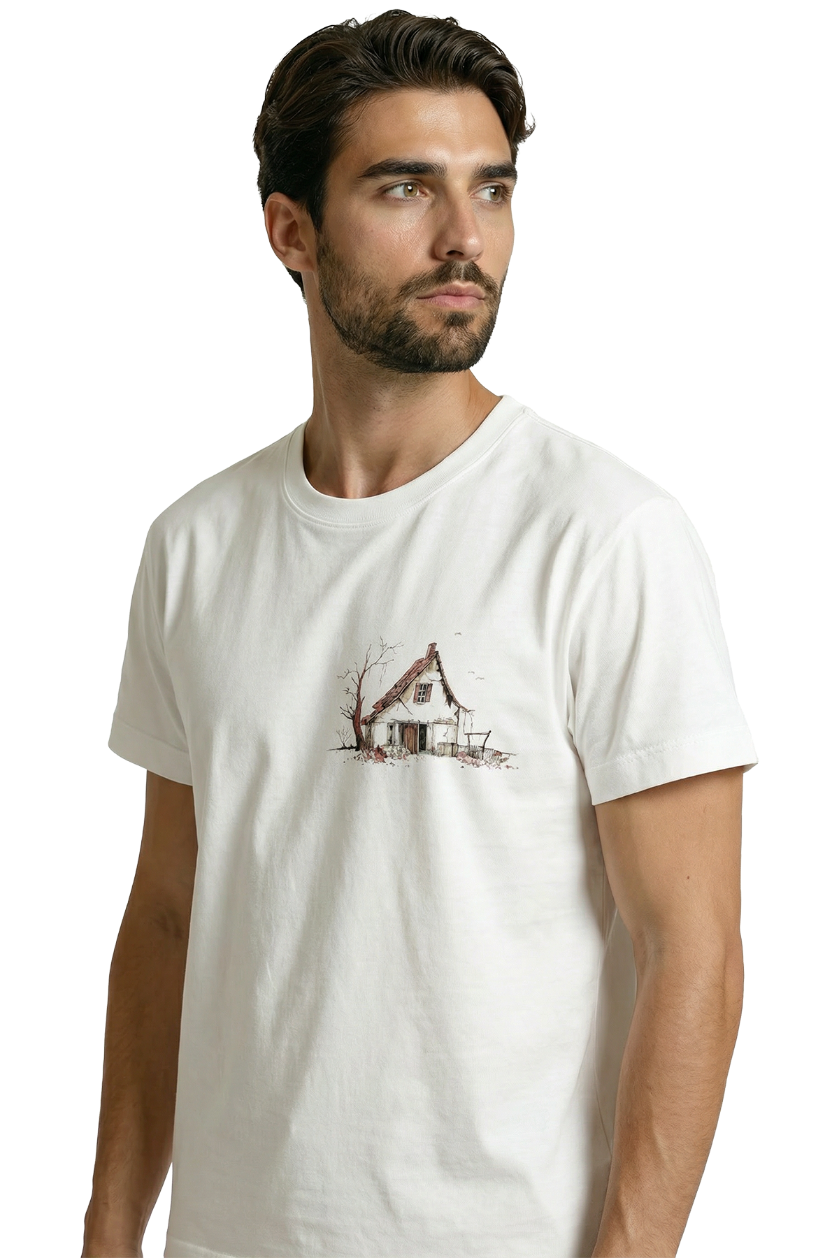 Minimalist Eskiz Köy Evi Baskılı Tasarım Premium Pamuk Erkek Tişört