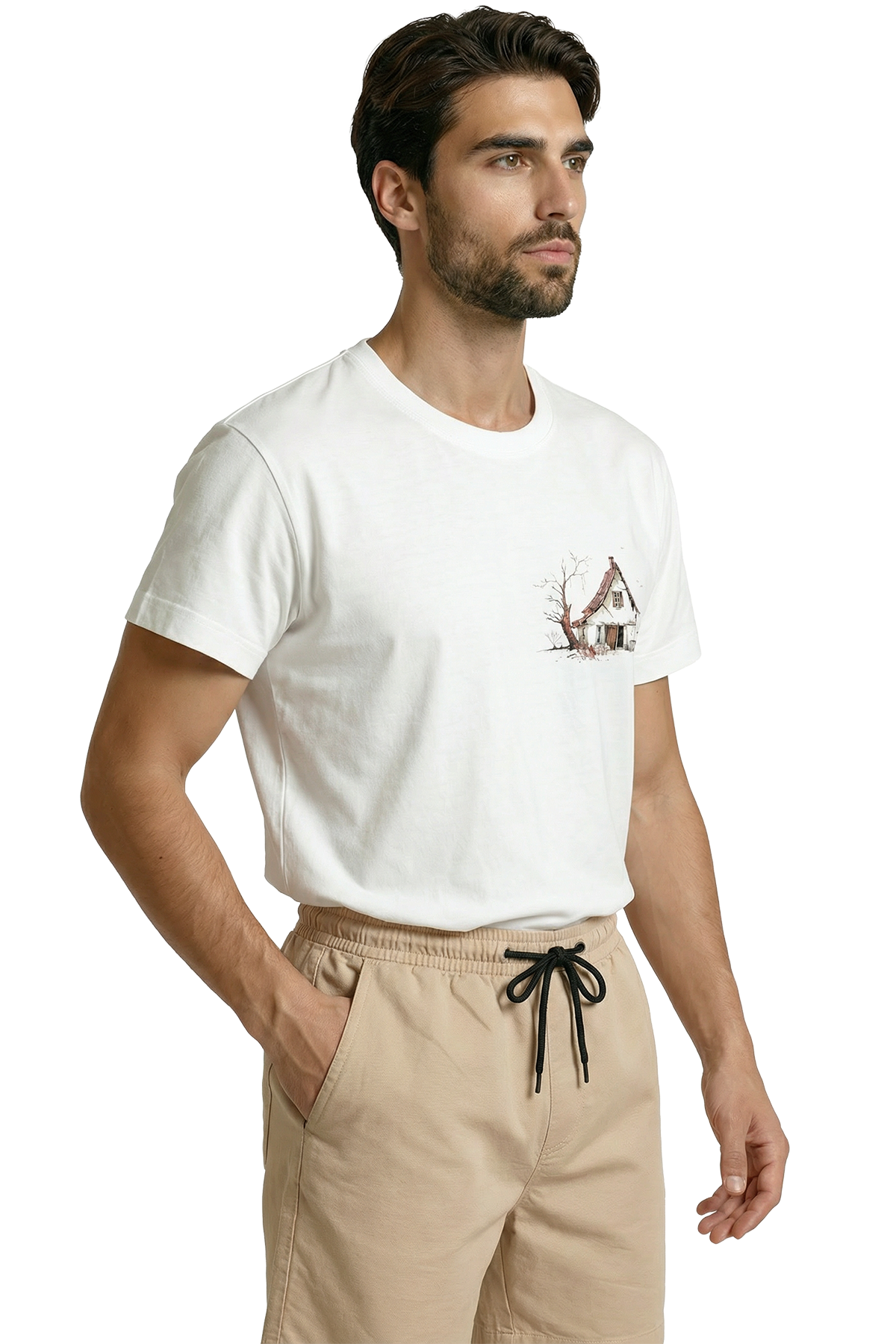 Karmaşadan uzak, minimalizmin gücüne inananlar için tasarlandı. Göğüs kısmında yer alan zarif ve sanatsal "Eskiz Köy Evi" çizimi, tişörte hem nostaljik bir hava katıyor hem de modern bir stil sunuyor. Büyük ve gürültülü baskılar yerine, detaylarda gizli kaliteyi ve sanatı tercih eden erkekler için, ceket içine veya tek başına giyilebilecek en "cool" parçalardan biri.