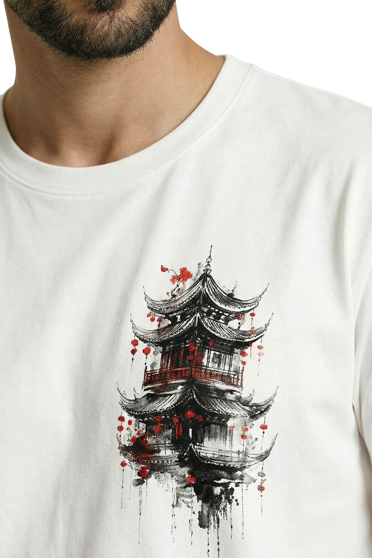 Mistik Uzak Doğu Pagoda ve Kırmızı Fenerler Baskılı Premium Erkek Tişört