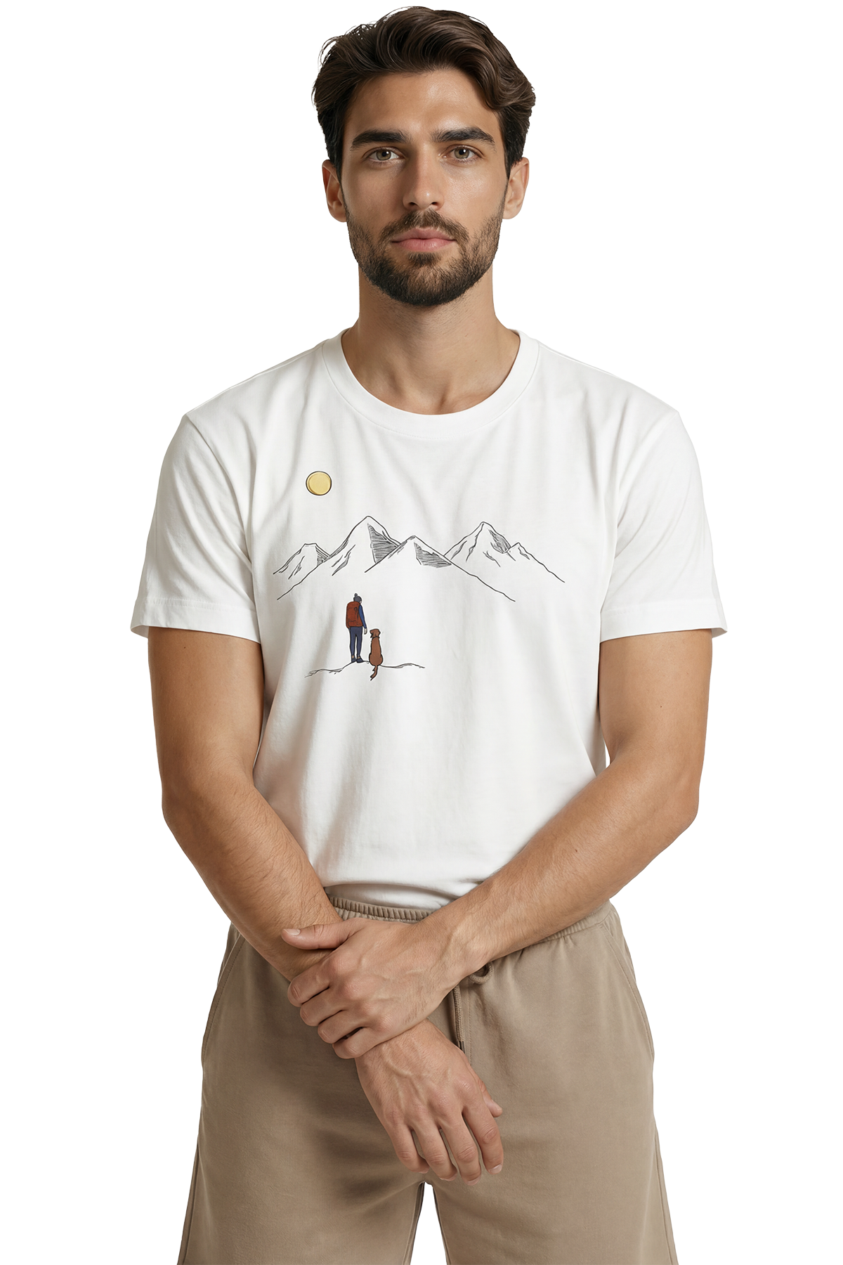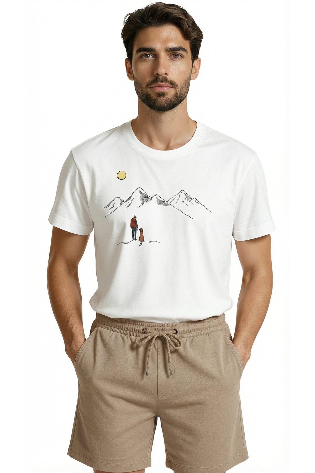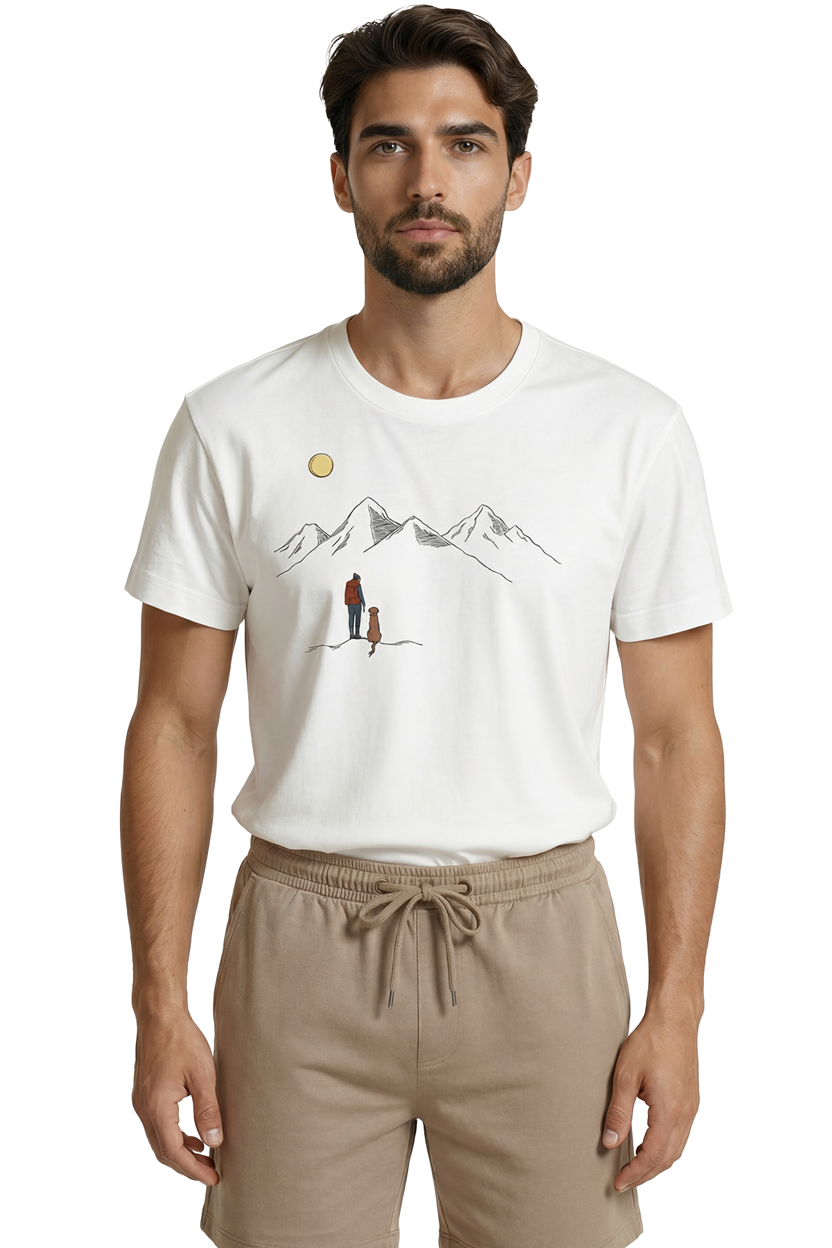 Gezgin ve Sadık Dostu Köpek Dağ Manzaralı Minimalist Tasarım Premium Erkek Tişört