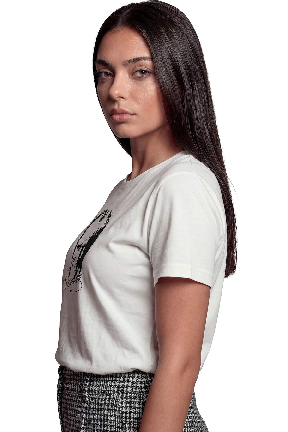 Nefes Alan Teknoloji: Tasarım, DTG (Direct to Garment) teknolojisiyle uygulanmıştır. Siyah portre ve imza detayları kumaşla bütünleşir, plastik hissi vermez ve terletme yapmaz.