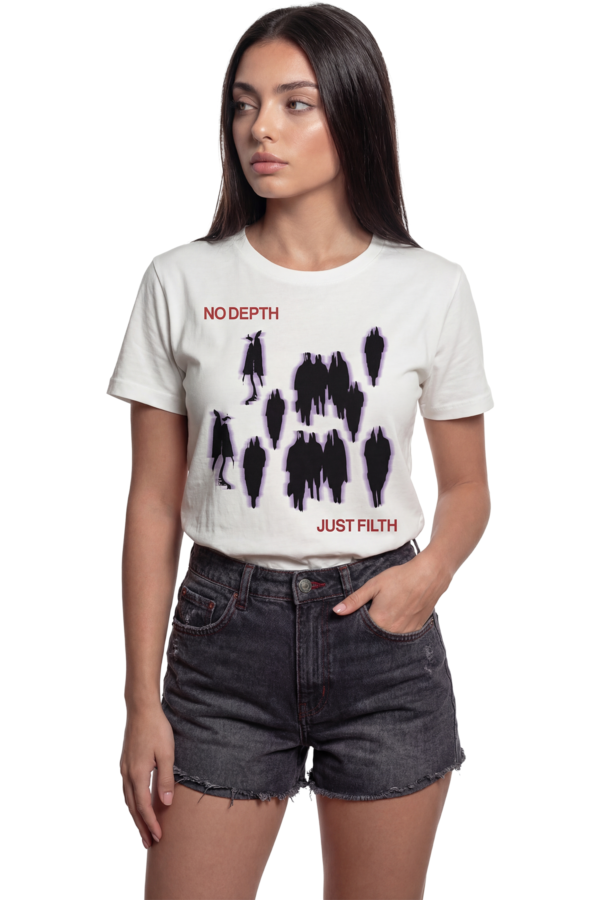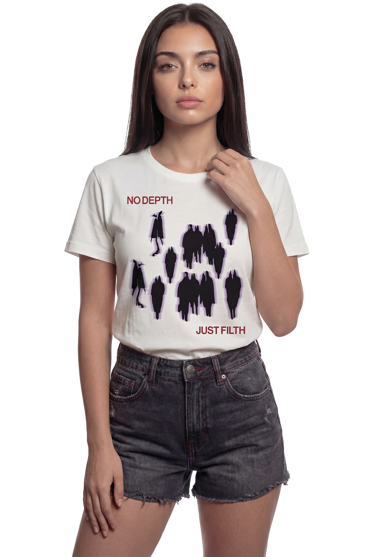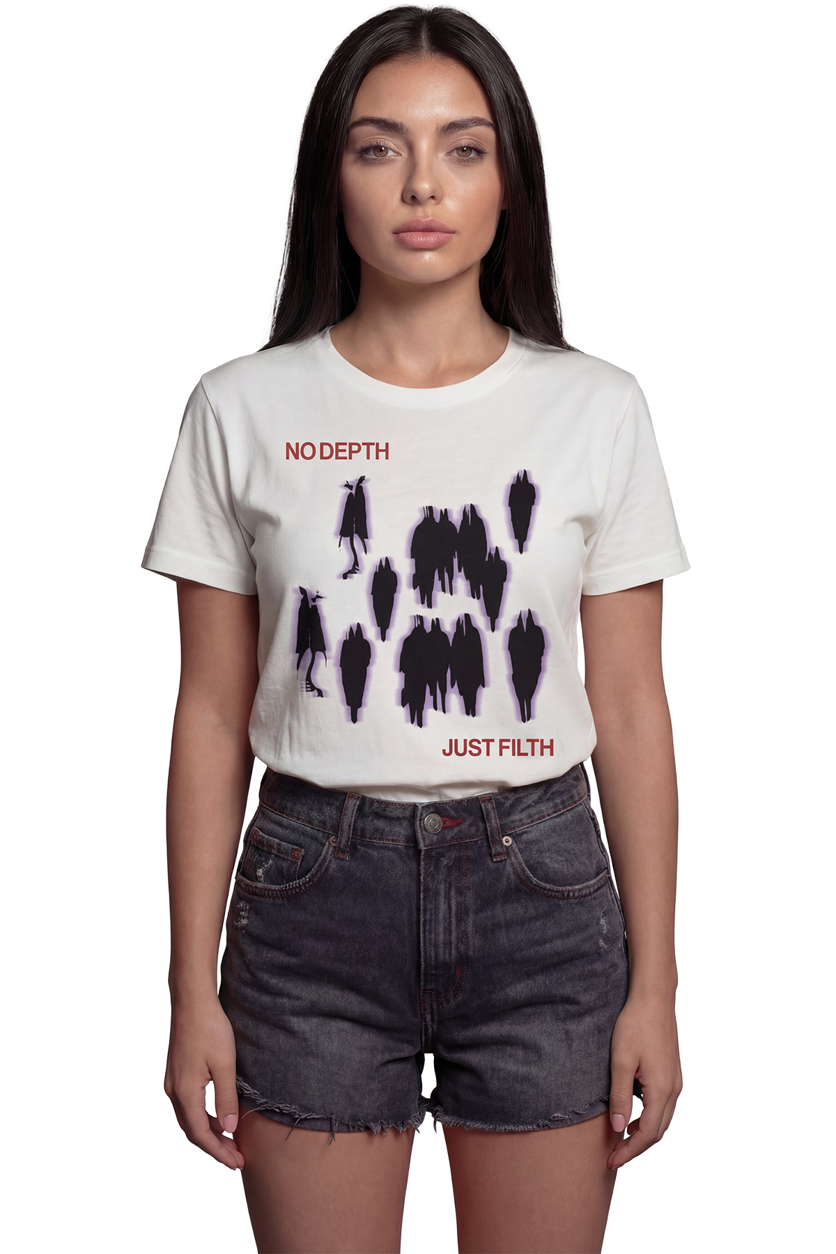 Kaotik Estetik: Grunge ve Modern Sıradanlığın dışına çıkın! "No Depth Just Filth" sloganı ve bulanık (blur) efektli kalabalık insan silüetleriyle tasarlanan bu tişört, modern sokak stilinin asi ve sorgulayıcı ruhunu yansıtıyor. Grunge estetiğini sevenler ve kombinlerinde derinlik arayanlar için dikkat çekici bir parça.