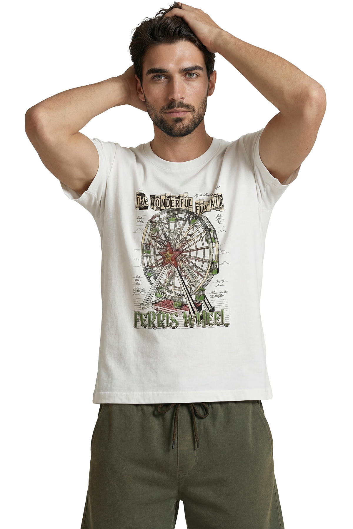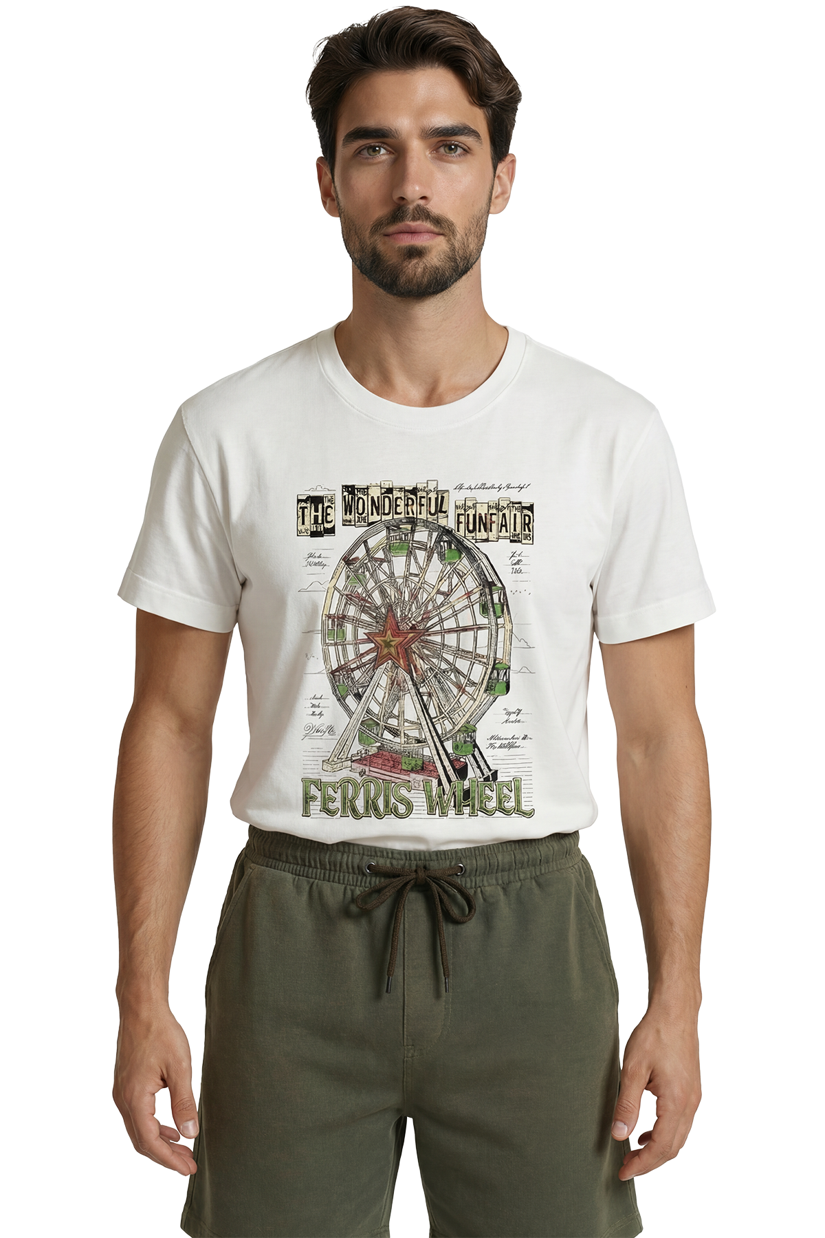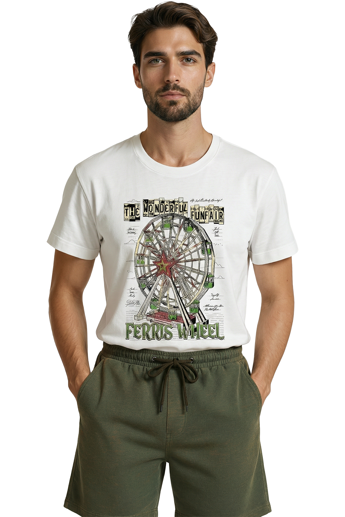 Işıklar, kahkahalar ve gökyüzüne uzanan o devasa çark... Çocukluğumuzun büyülü dünyası lunaparkların neşesini, vintage bir estetikle stilinize taşıyın. "The Wonderful Funfair" yazısı ve detaylı "Ferris Wheel" (Dönme Dolap) illüstrasyonuyla tasarlanan bu tişört; eski karnaval posterlerinin nostaljik havasını yansıtıyor. Hem retro giyim tarzını benimseyenler hem de hayatın eğlenceli tarafına odaklananlar için, geçmişten gelen şık bir selam.