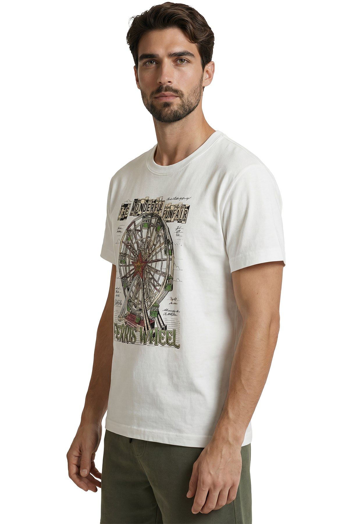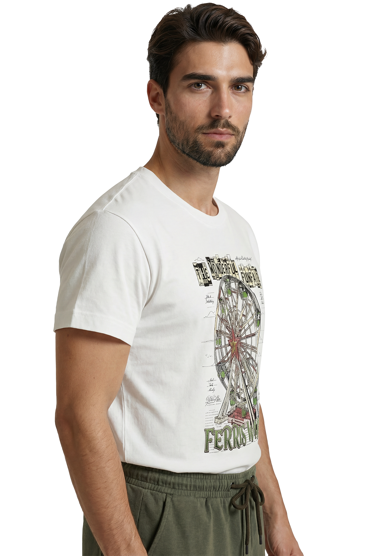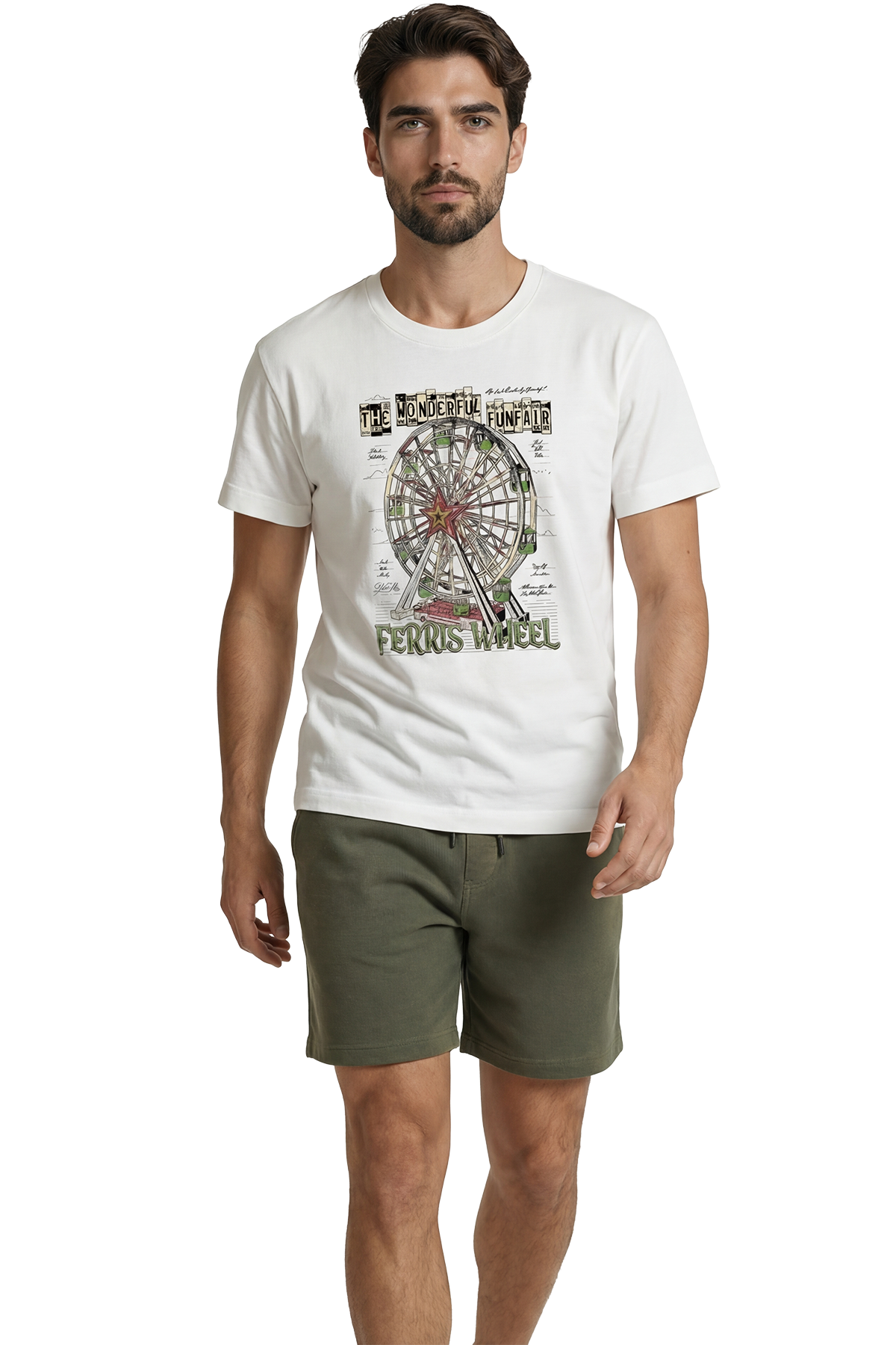 Işıklar, kahkahalar ve gökyüzüne uzanan o devasa çark... Çocukluğumuzun büyülü dünyası lunaparkların neşesini, vintage bir estetikle stilinize taşıyın. "The Wonderful Funfair" yazısı ve detaylı "Ferris Wheel" (Dönme Dolap) illüstrasyonuyla tasarlanan bu tişört; eski karnaval posterlerinin nostaljik havasını yansıtıyor. Hem retro giyim tarzını benimseyenler hem de hayatın eğlenceli tarafına odaklananlar için, geçmişten gelen şık bir selam.