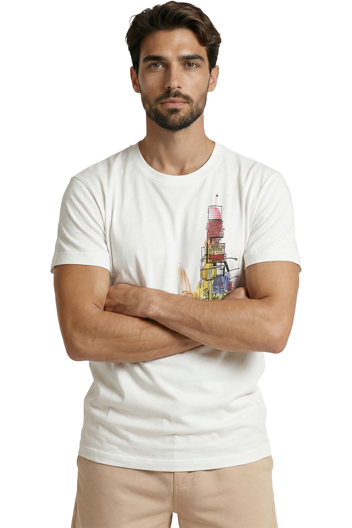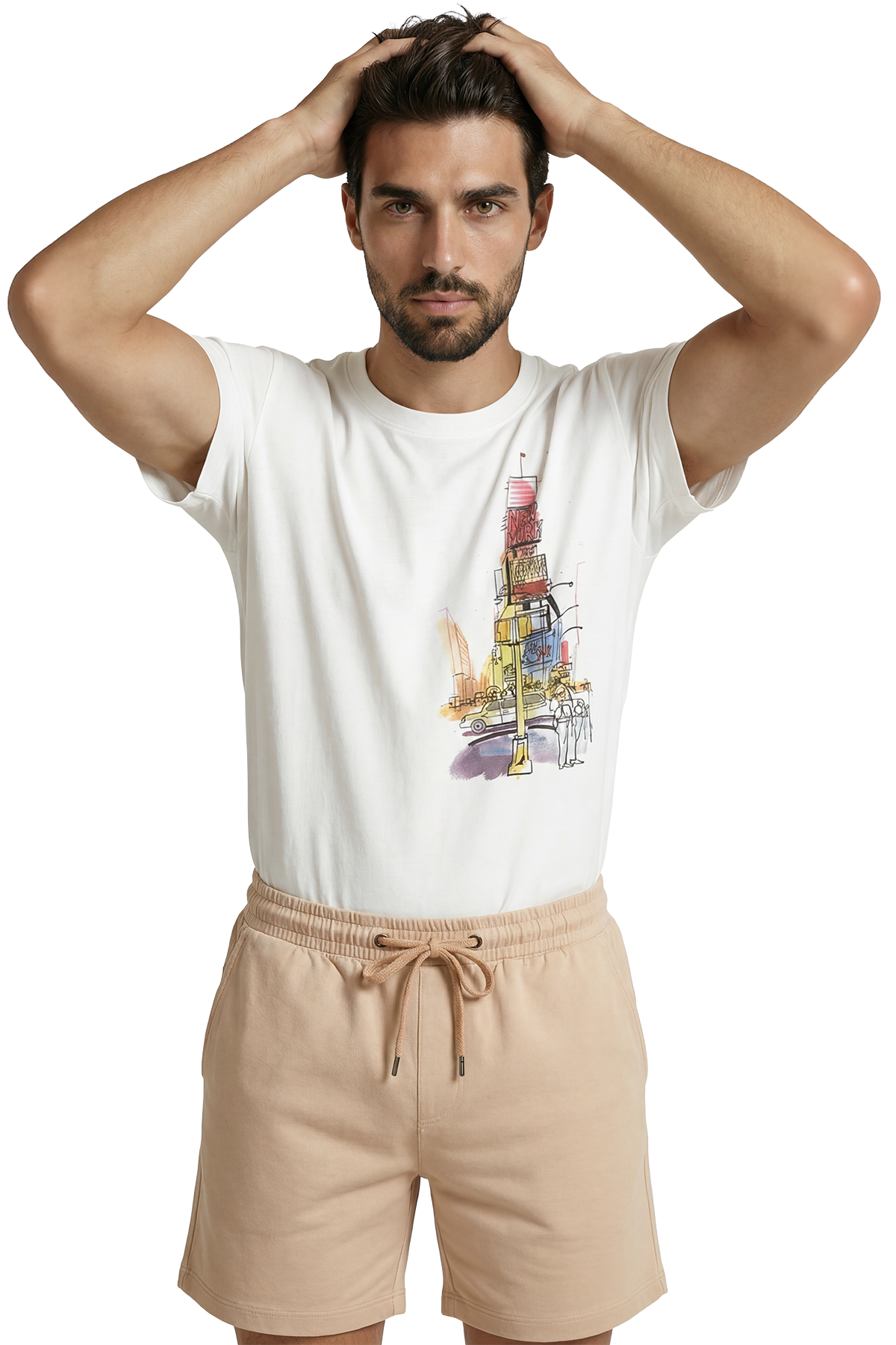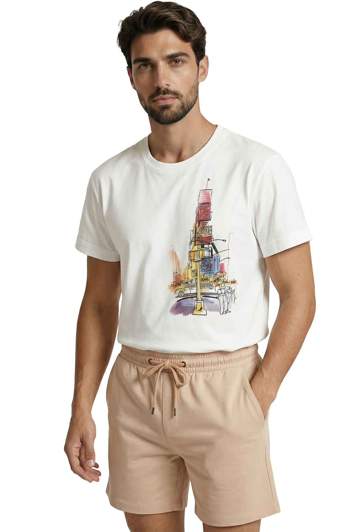 Dünyanın en ünlü meydanının ışıltısını ve New York'un bitmeyen enerjisini stilinize taşıyın. Times Square'in ikonik tabelalarını, gökdelenlerini ve caddenin ritmini betimleyen bu tasarım; "Urban Sketch" (Şehir Eskizi) sanatının salaş ve renkli diliyle hayat buluyor. Sulu boya efektlerinin canlılığı ve mürekkep çizgilerinin detaylarıyla bezenmiş bu tişört; hem seyahat tutkunları hem de metropol hayatının dinamizmini seven erkekler için modern ve sofistike bir seçenek.
