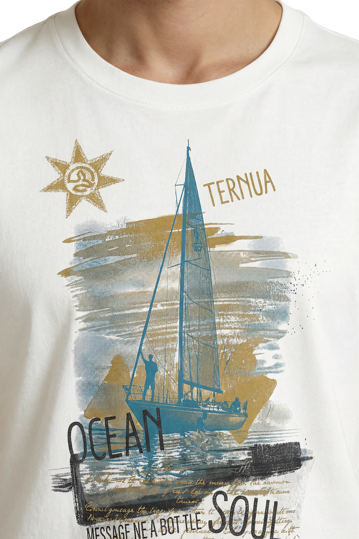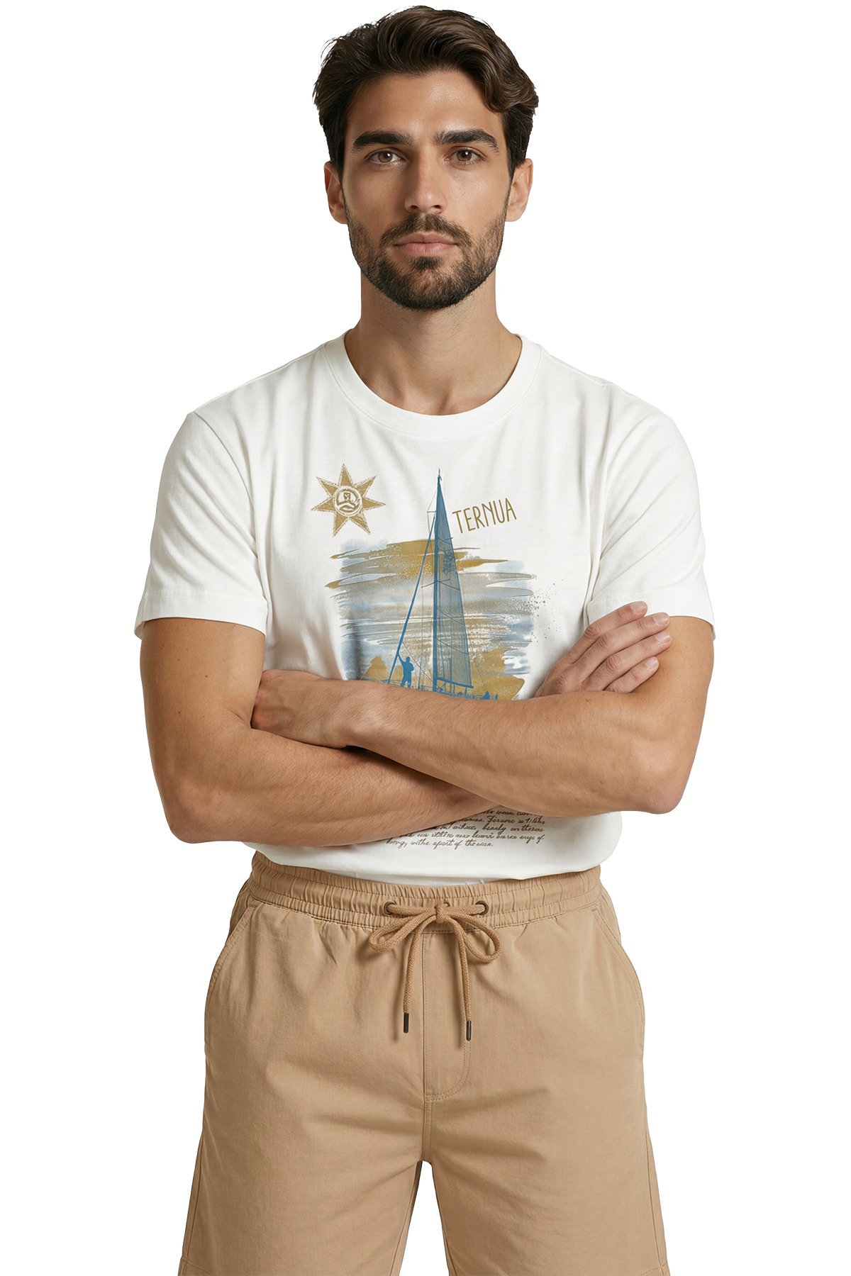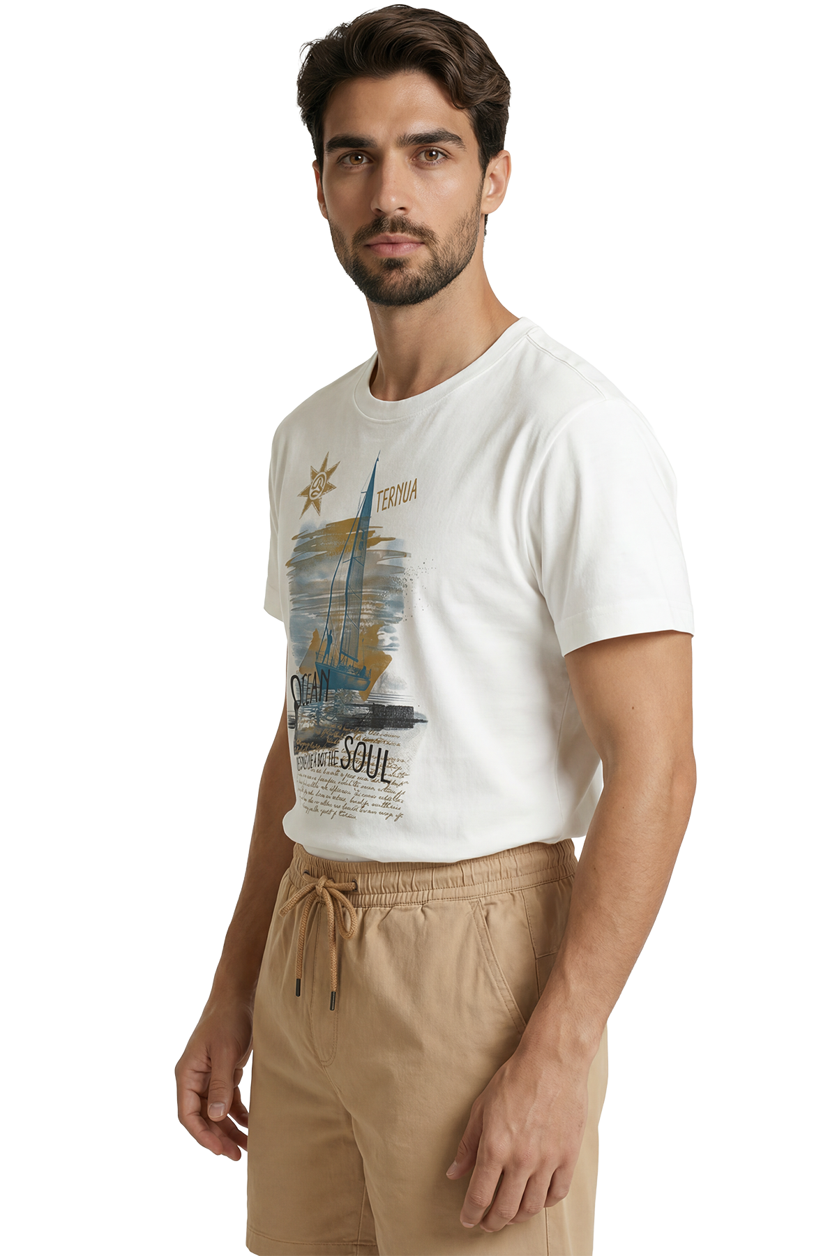 Deniz sadece bir manzara değil, bir yaşam biçimidir. Maviliklere olan tutkuyu, rüzgarın yelkenleri doldurduğu o özgür anı stilinize taşıyın. "Ocean Soul" (Okyanus Ruhu) mottosu ve vintage tarzda çizilmiş yelkenli figürüyle tasarlanan bu tişört; denizin dinginliğini ve maceranın heyecanını bir araya getiriyor. Bej ve mavi tonlarının uyumuyla, hem teknede hem de şehirde yazın ferahlığını üzerinizde hissettirecek şık bir parça.