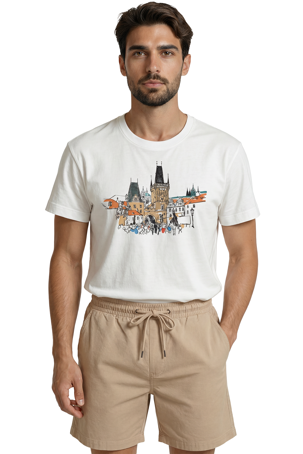 Orta Avrupa'nın kalbi, gotik kulelerin ve kırmızı kiremitli çatıların şehri Prag'ı stilinize taşıyın. Tarihi "Old Town" (Eski Şehir) meydanını ve ikonik kuleleri betimleyen bu tasarım; bir seyahat defterinden çıkmış gibi duran "Urban Sketch" tarzıyla dikkat çekiyor. İnce mürekkep çizgilerinin, yumuşak pastel renklerle renklendirildiği bu çalışma; seyahat etmeyi seven, mimariye ilgi duyan ve kültürel birikimini giyimine yansıtmak isteyen erkekler için tasarlandı.