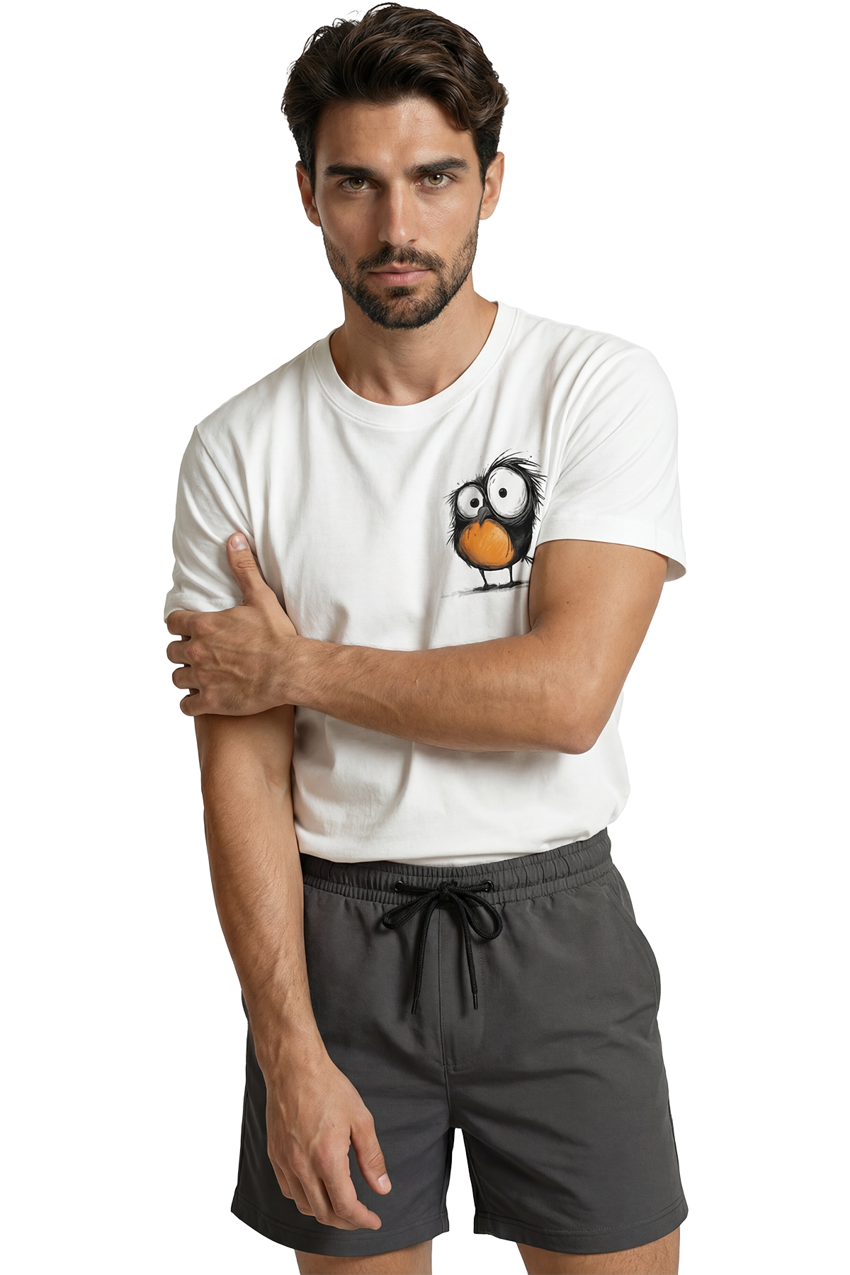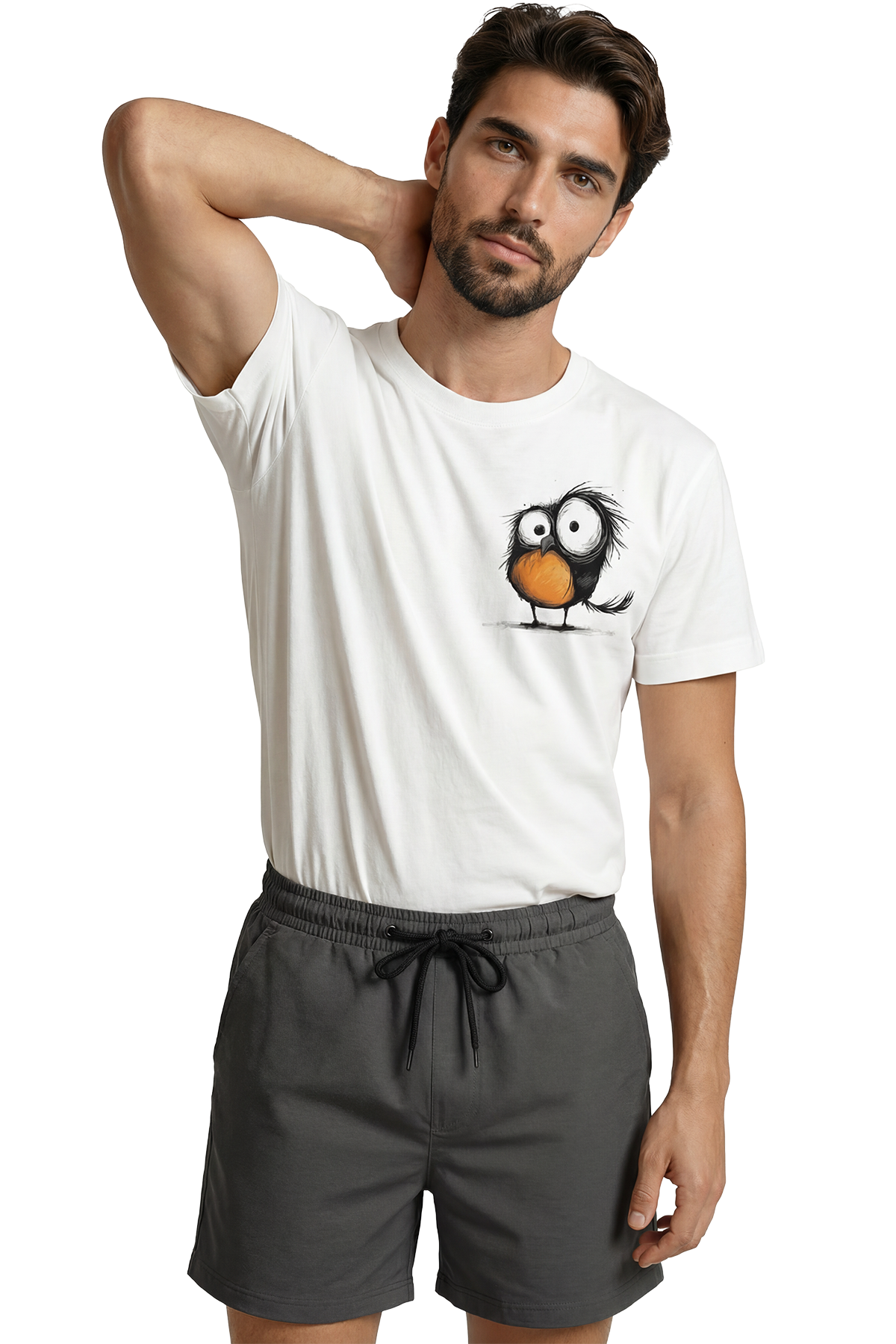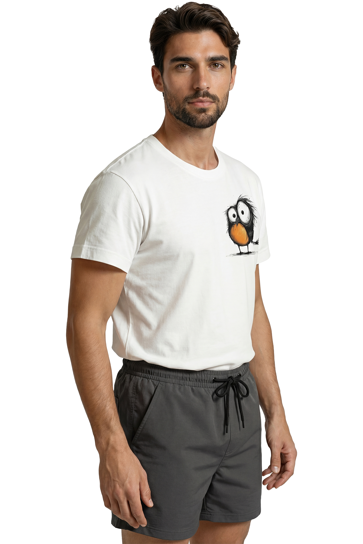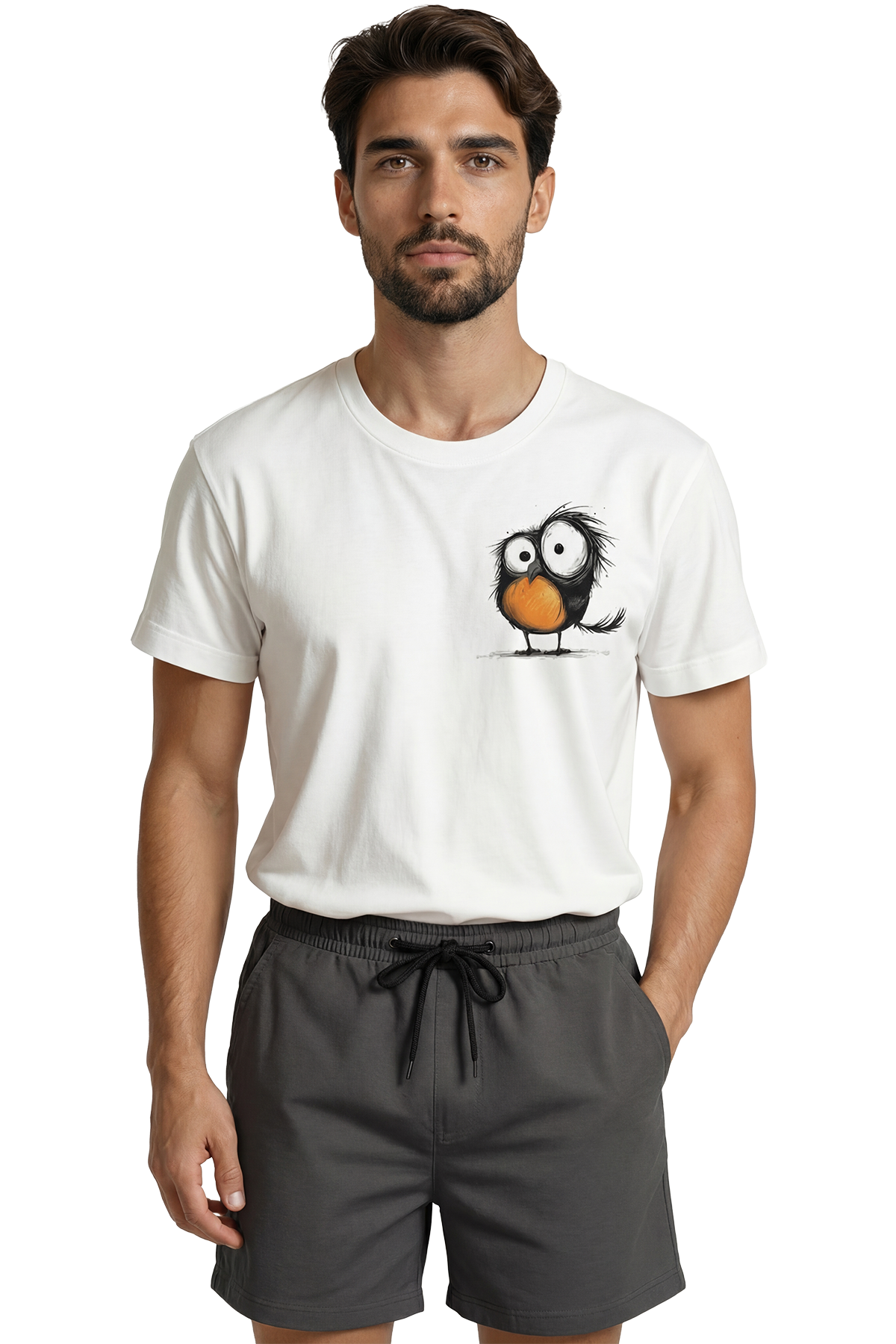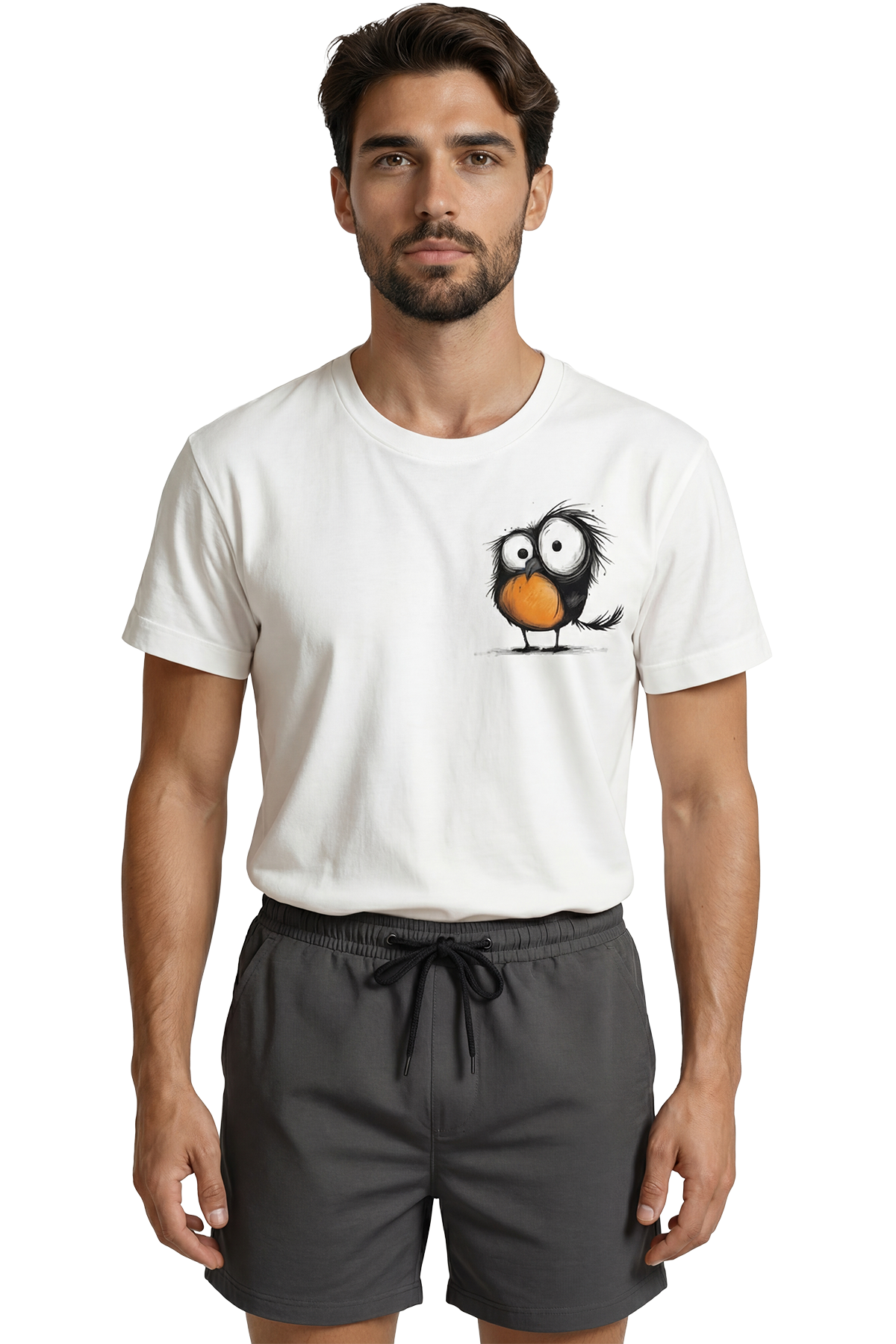 Bazen hayat çok ciddidir ve bunu bozacak bir gülümsemeye ihtiyaç duyarsınız. Kocaman gözleri, dağınık tüyleri ve "Ne oluyor burada?" diyen şaşkın ifadesiyle bu sevimli kuş figürü, tişörtünüze mizah ve sempati katıyor. Karakalem eskiz tarzında çizilmiş ve turuncu gövdesiyle renklendirilmiş bu tasarım; eğlenceli kişiliğini stiline yansıtmak isteyen, içindeki çocuğu kaybetmeyen erkekler için harika bir "buz kırıcı".