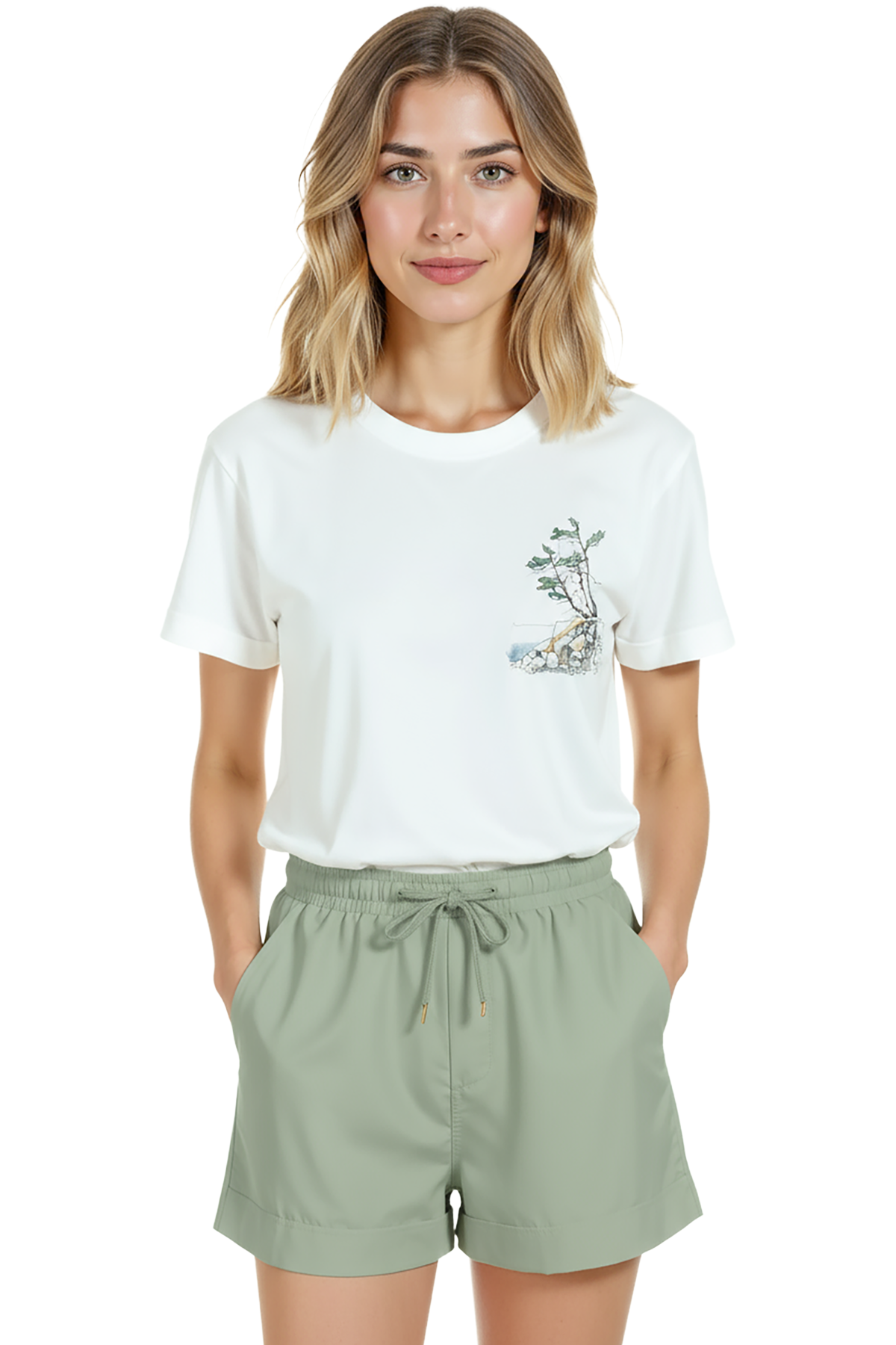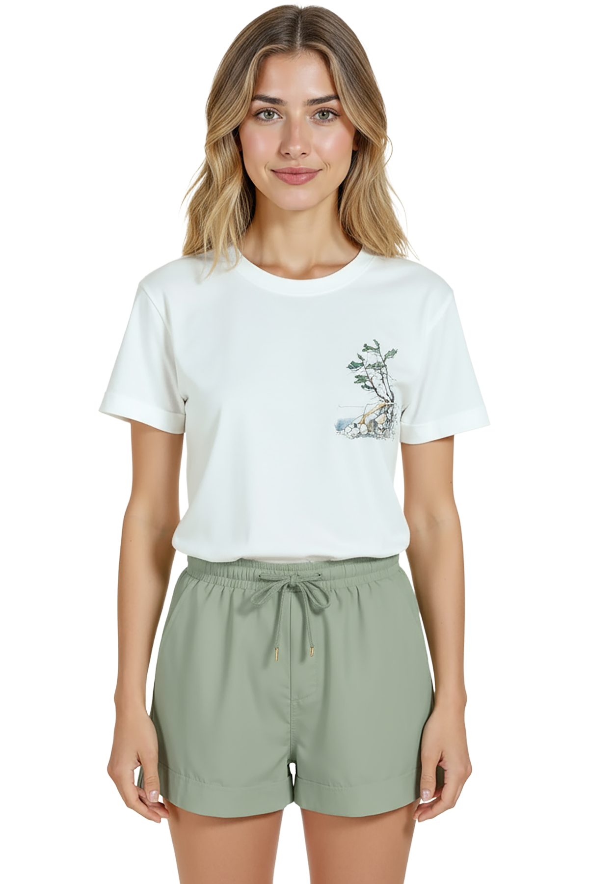 Kadın Beyaz Relaxed Fit %100 Pamuk Tişört – Kıyı Ağacı Suluboya Minyatür Baskılı