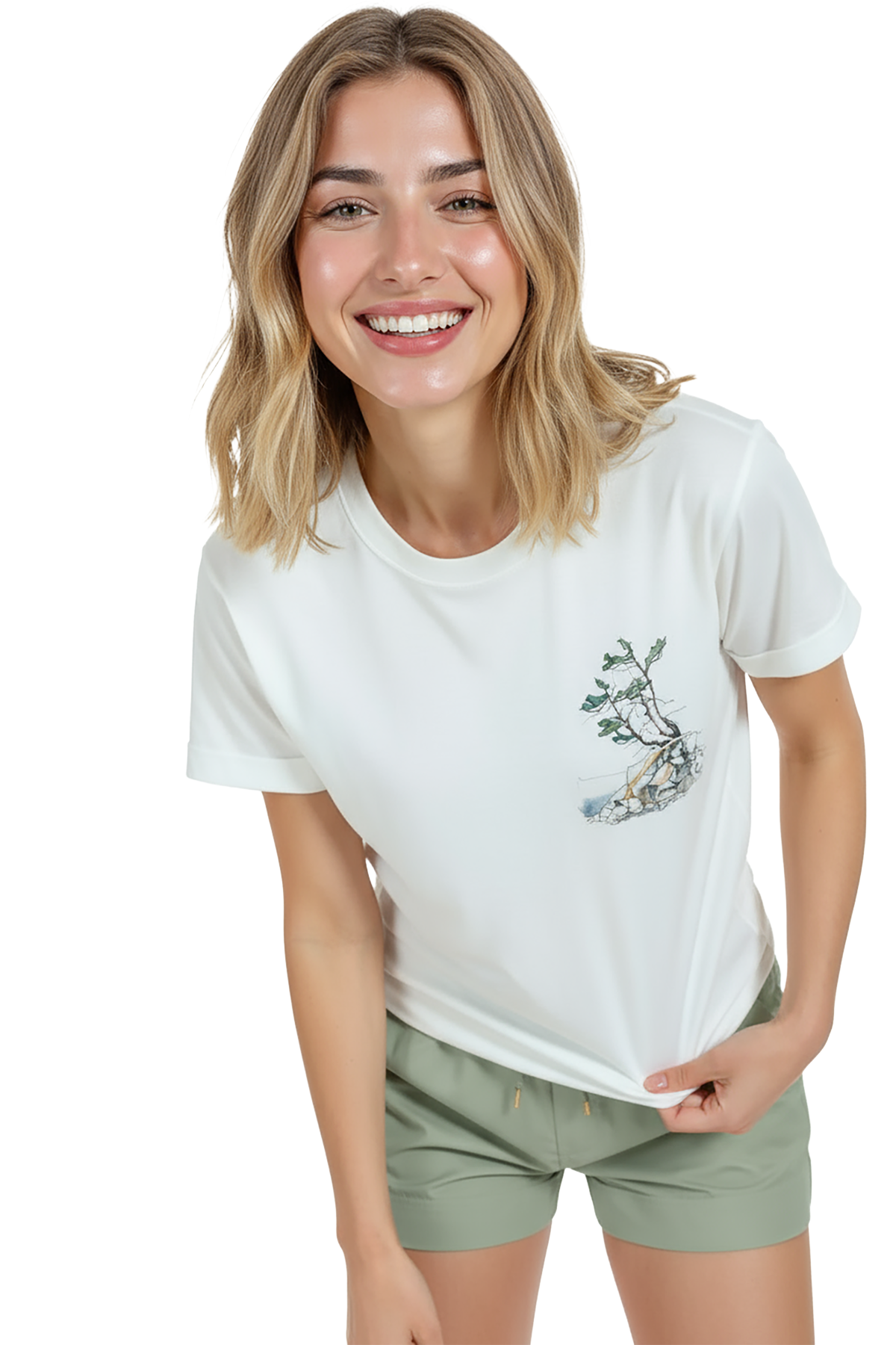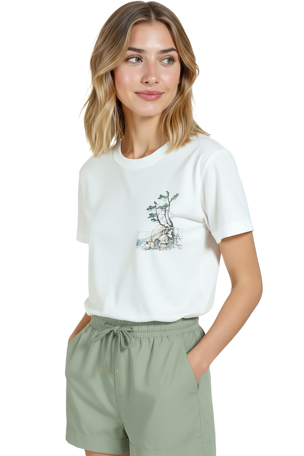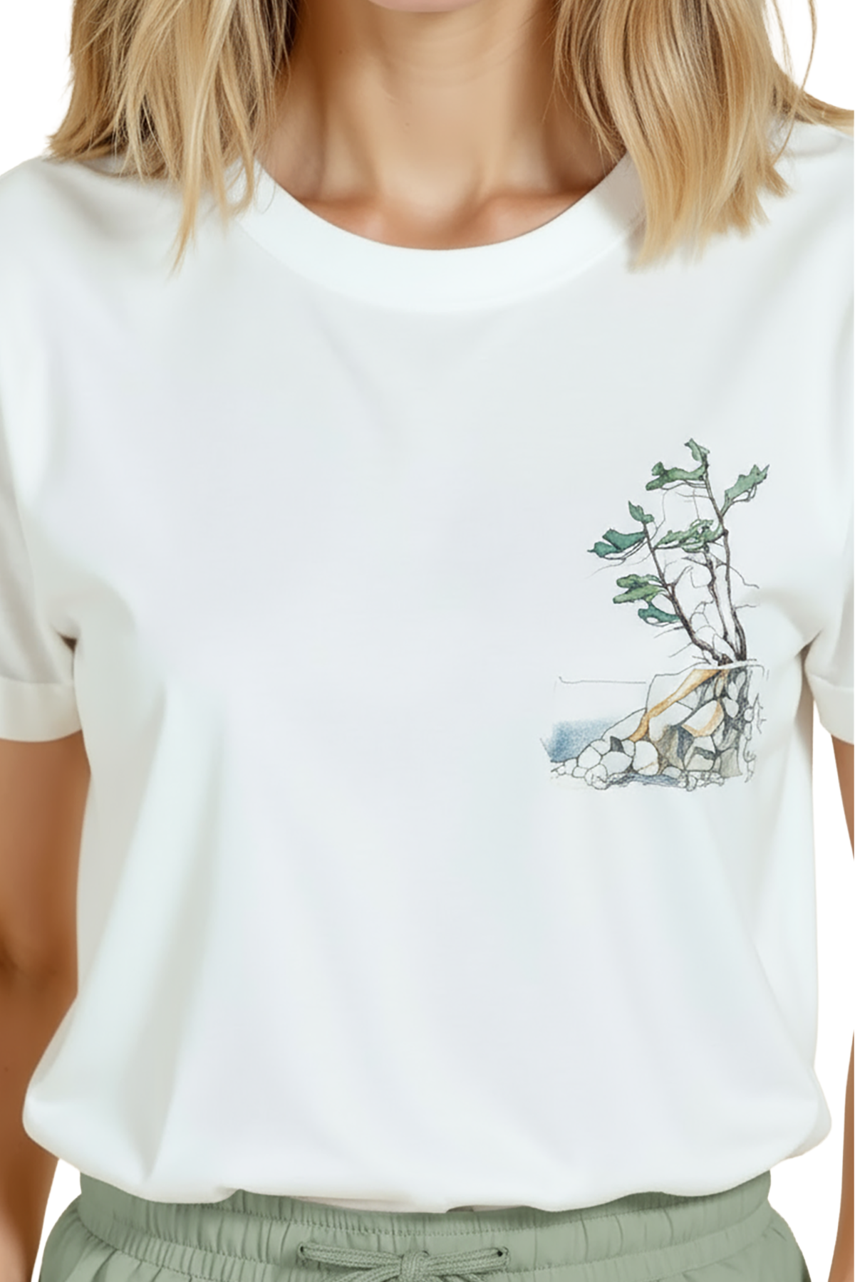 Doğanın sakinliğini ve fragman benzeri bir sahneyi taşıyan kadın tişörtü. Bu beyaz relaxed fit (kadın kesim) tişörtün sol göğsünde yer alan kıyı kayalıkları üzerinde rüzgârla eğilmiş ağaç illüstrasyonu ve yumuşak mavi‑yeşil suluboya dokusu, minimal ama anlatı yüklü bir görünüm sunar. Ürün %100 pamuk olup relaxed fit kesimi sayesinde yumuşaklık, nefes alabilirlik ve gün boyu rahatlık sağlar. Desen yüksek çözünürlüklü dijital baskı ile uygulanmış; ince dal detayları ve suluboya geçişleri uzun süre canlı kalacak şekilde basılmıştır. Günlük şehir kombinleri, doğa temalı kafe‑stili ve minimal‑sanatsal gardıroplar için ideal bir parça.