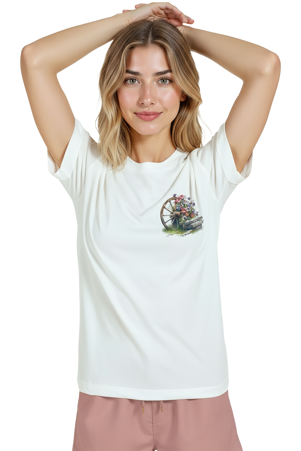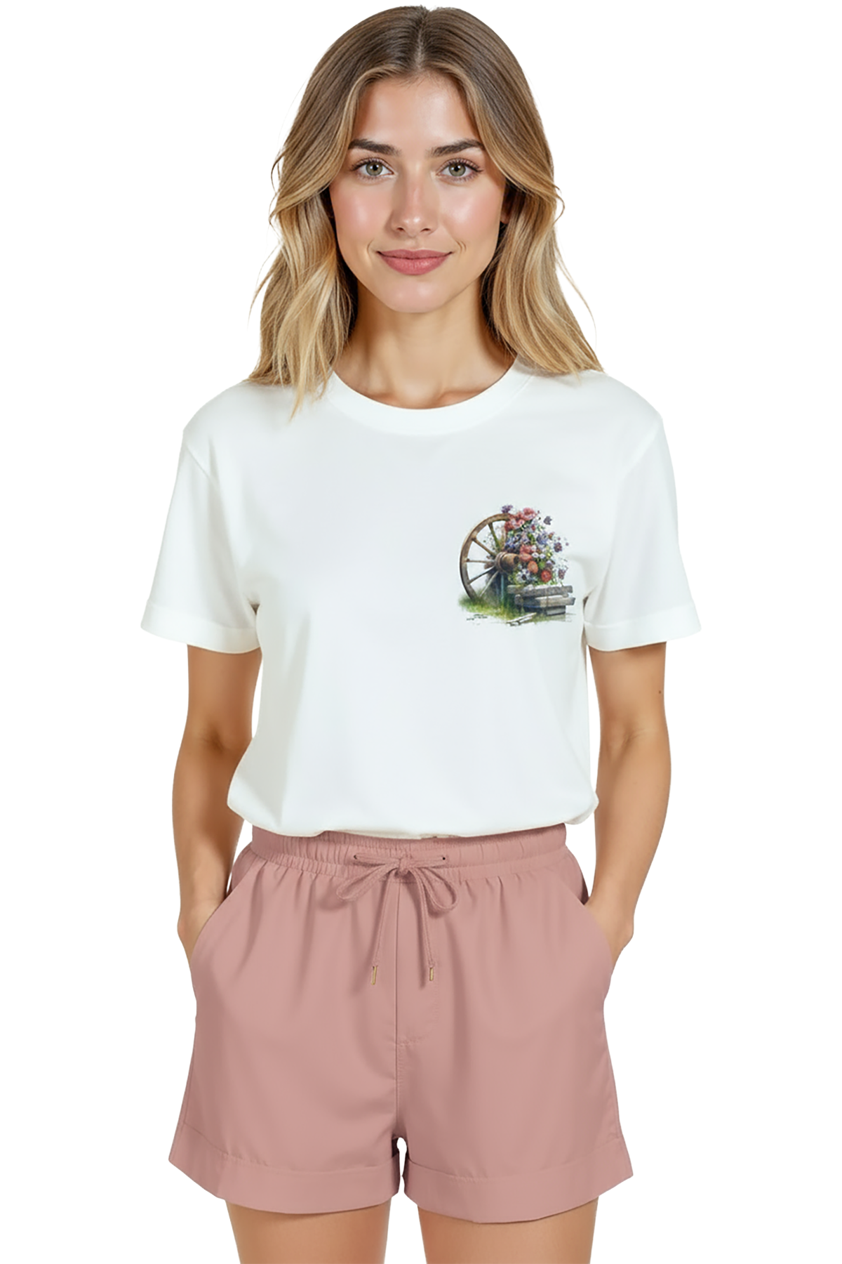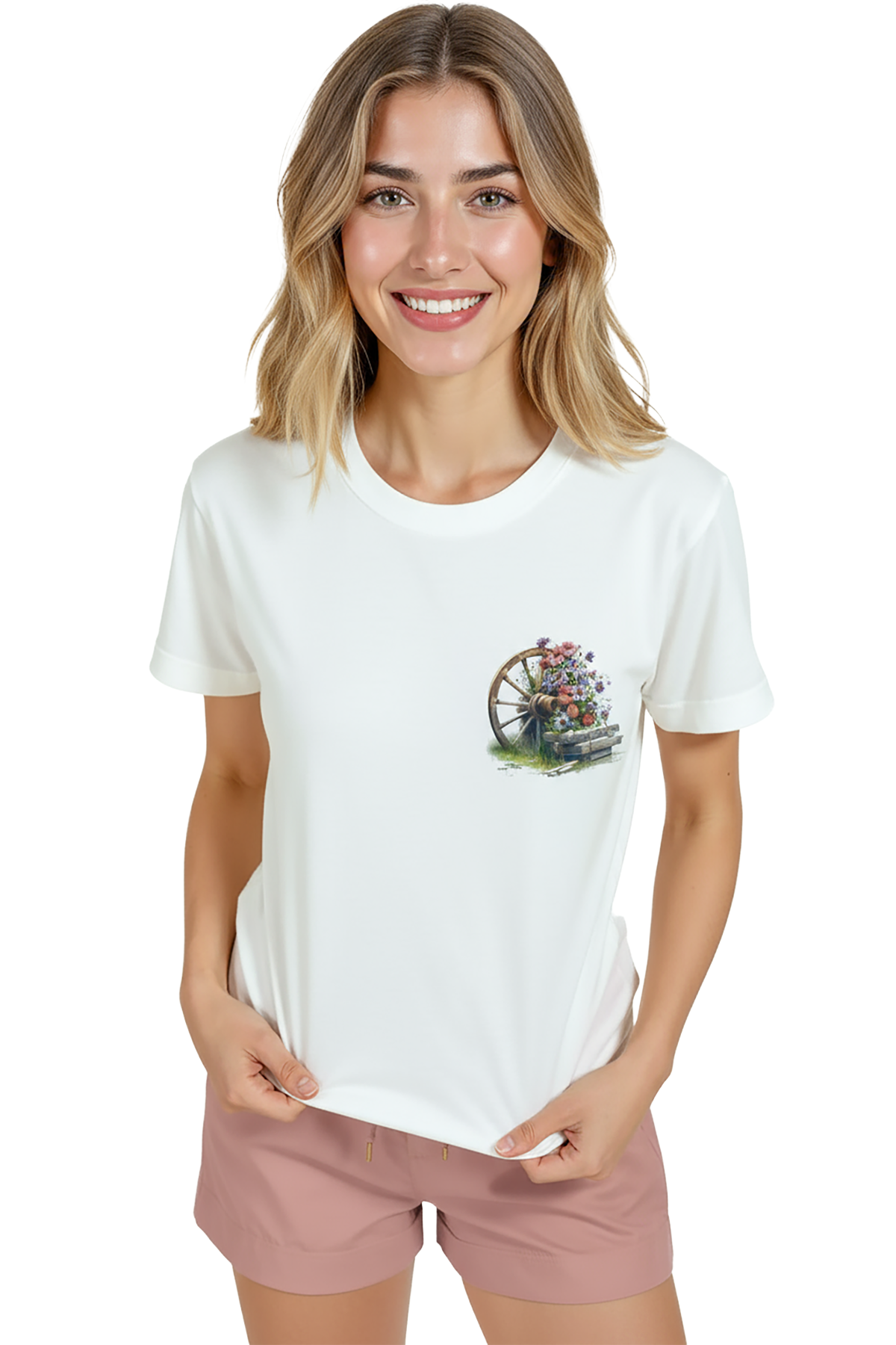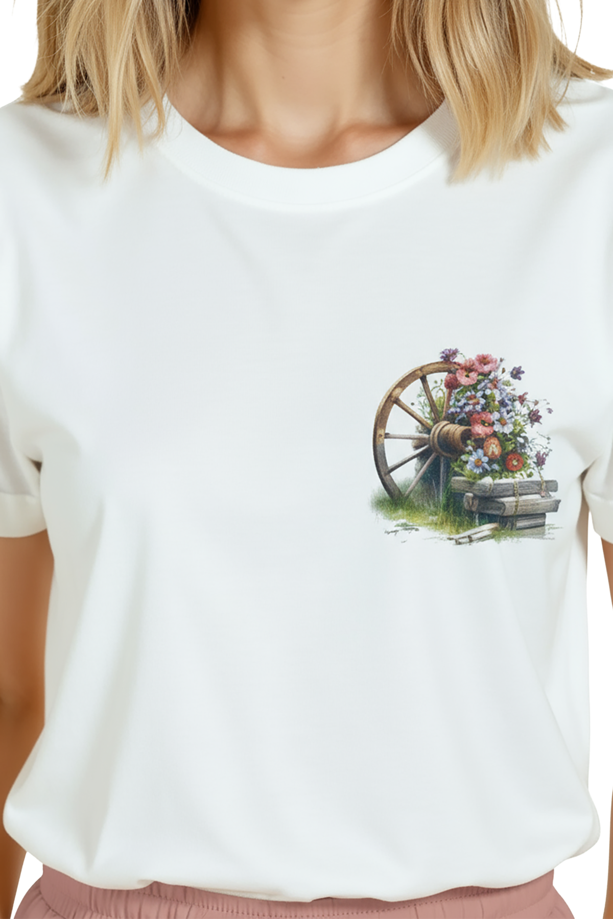 Pastoral ve naif bir dokunuş taşıyan kadın tişörtü. Bu beyaz relaxed fit (kadın kesim) tişörtün sol göğsünde yer alan eski tekerlek üzerinde düzenlenmiş canlı çiçek buketi minyatür baskısı, yumuşak suluboya geçişleri ve ince karakalem konturlarla hem nostaljik hem zarif bir görünüm sunar. Ürün %100 pamuk olup relaxed fit kesimi sayesinde gün boyu yumuşaklık, nefes alabilirlik ve rahat hareket sağlar. Desen yüksek çözünürlüklü dijital baskı ile uygulanmıştır; suluboya dokusu ve ince detaylar uzun süre canlı kalacak şekilde basılmıştır. Günlük şehir kombinleri, kafe‑stili ve minimal‑romantik gardıroplar için ideal, hediye seçeneklerinde öne çıkan bir parça.