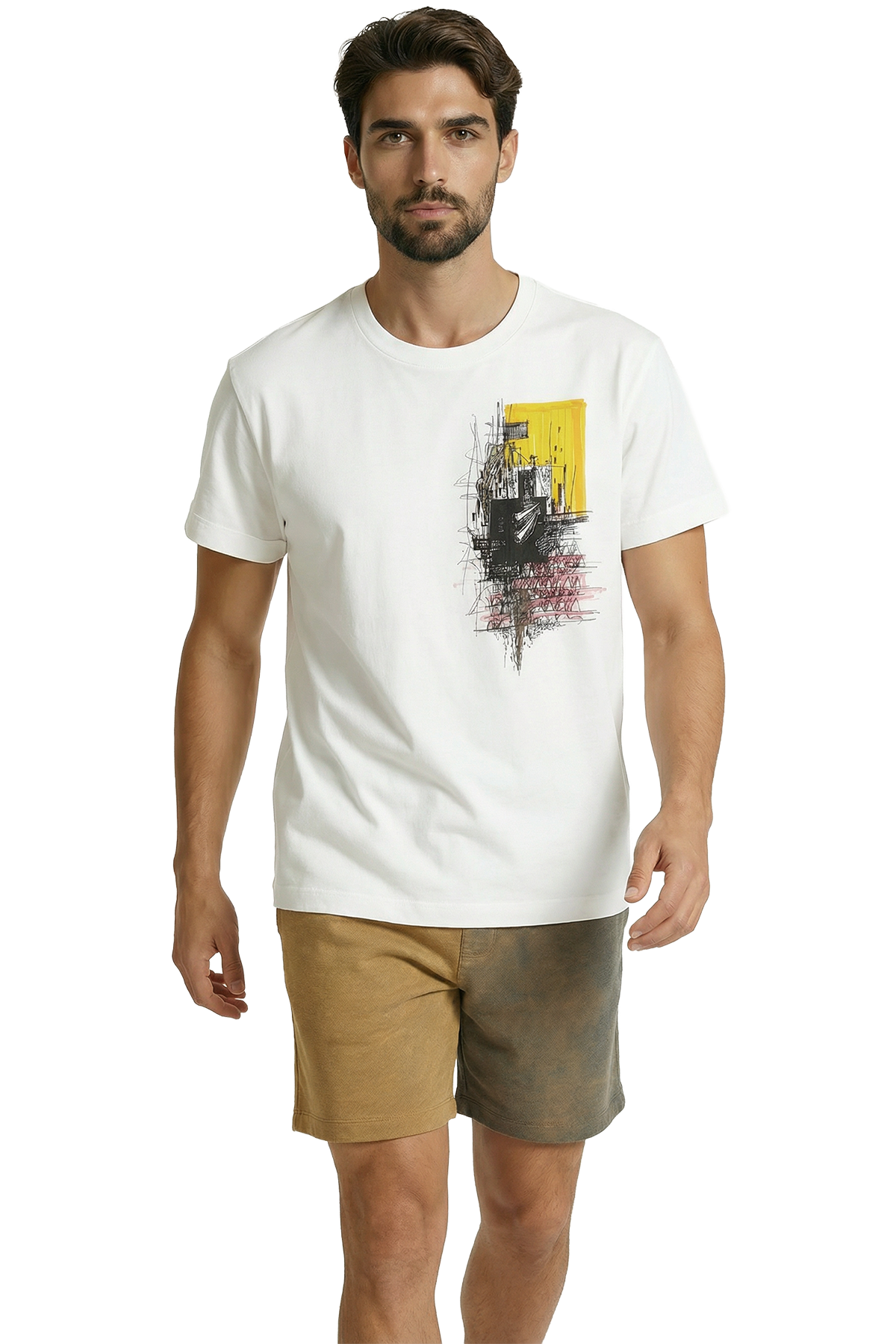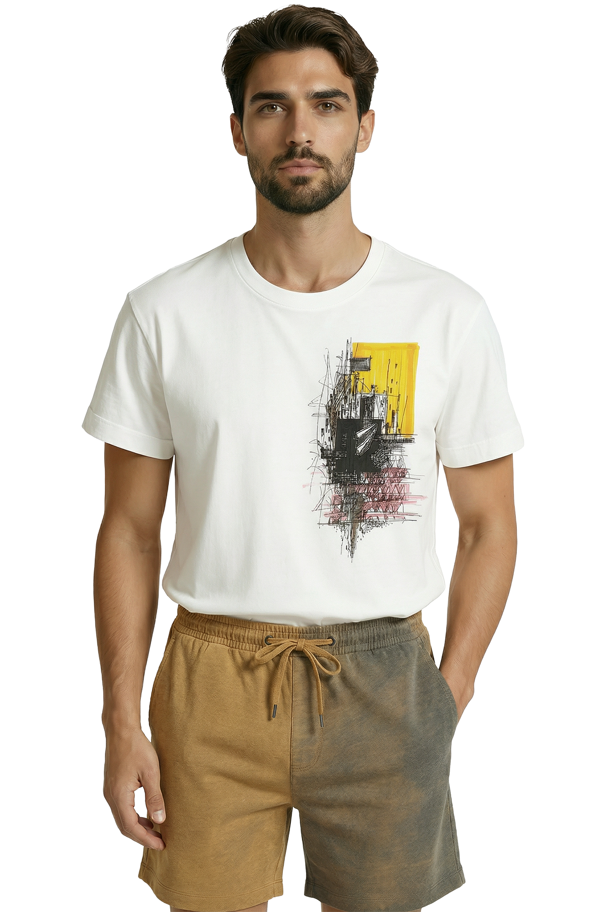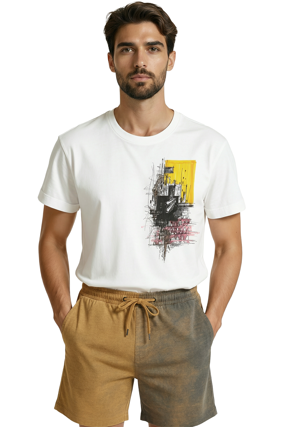 Şehrin dinamizmini ve mimari estetiği, soyut çizgilerle yorumlayan bu tasarım; sanatı hayatının merkezine koyan erkekler için tasarlandı. Sarı ve siyahın güçlü kontrastı ile eskiz sanatının salaş şıklığını birleştiren bu model, sıradan baskıların çok ötesinde, entelektüel bir duruş sergiliyor. İster bir sanat galerisi açılışında, ister şık bir kafede; stilinizle fark yaratın.