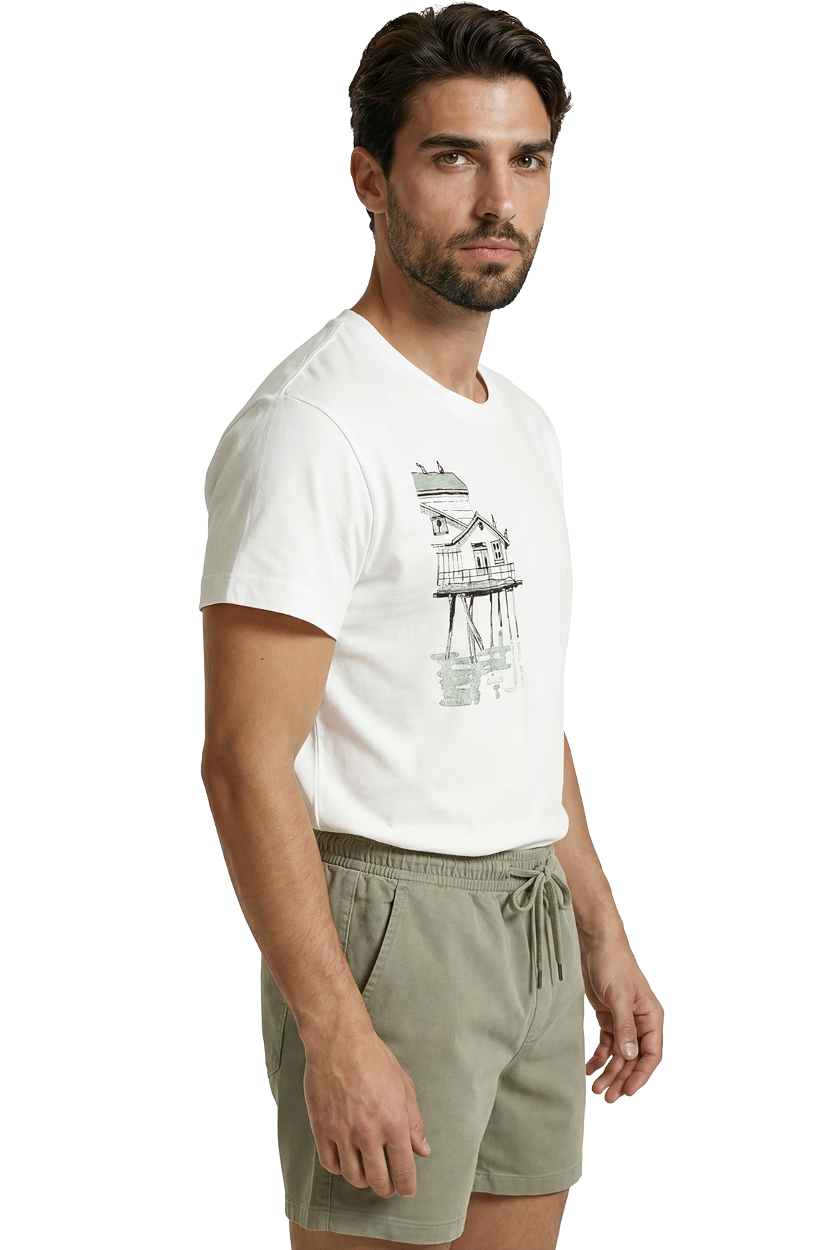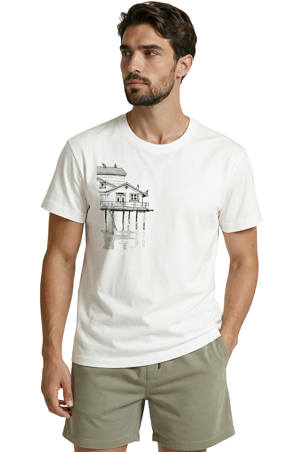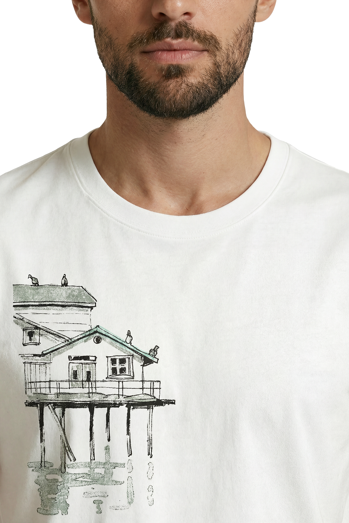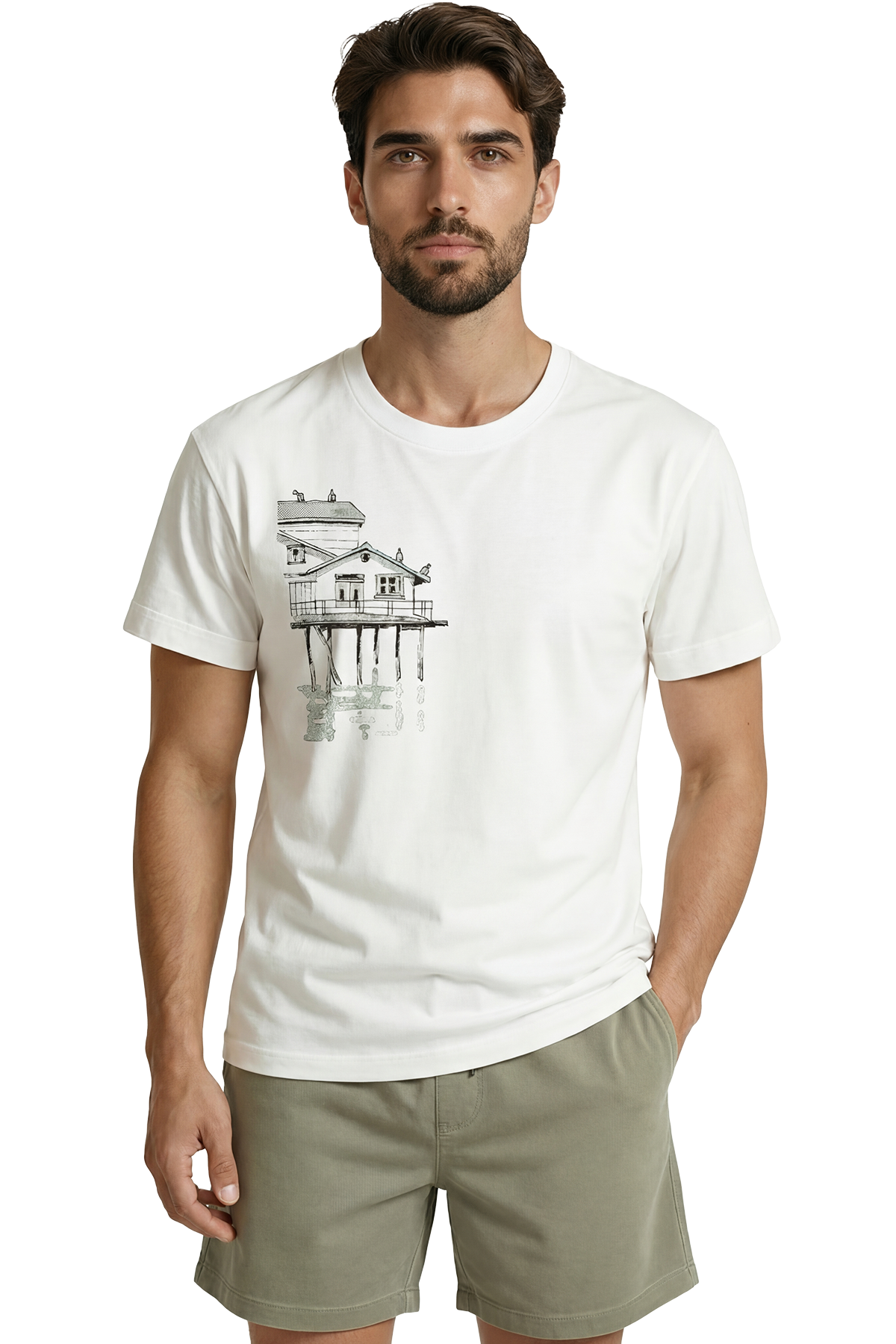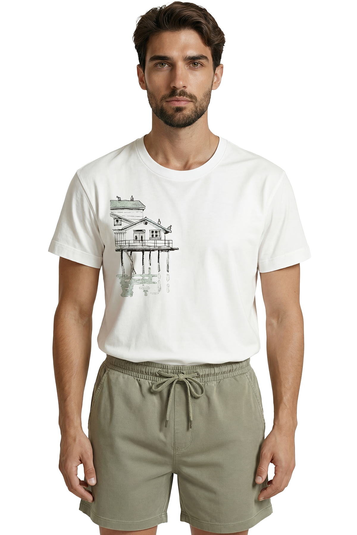 Göl Üzerinde Ahşap Ev ve Yansıma Eskiz Baskılı Minimalist Premium Erkek Tişört