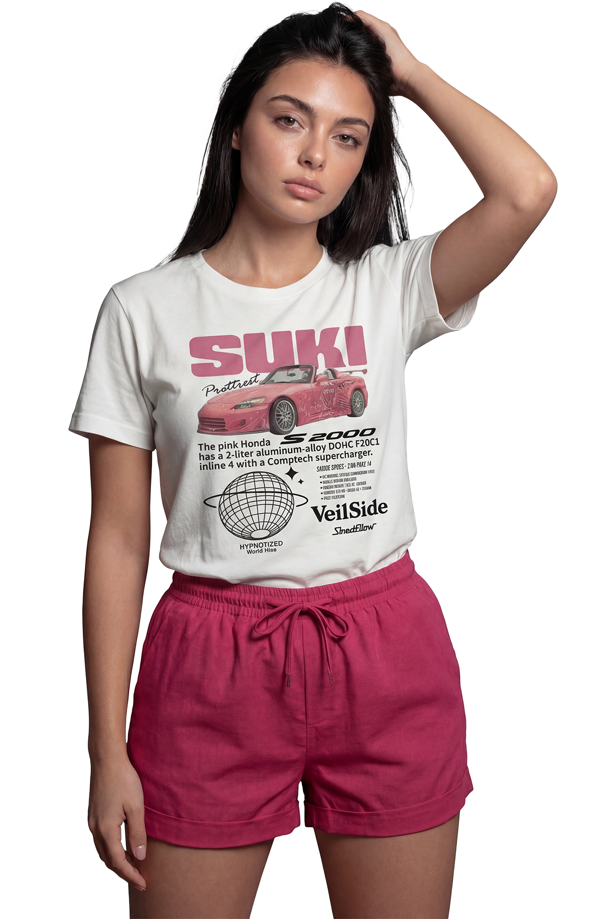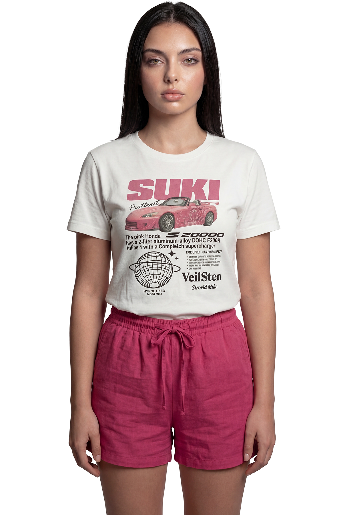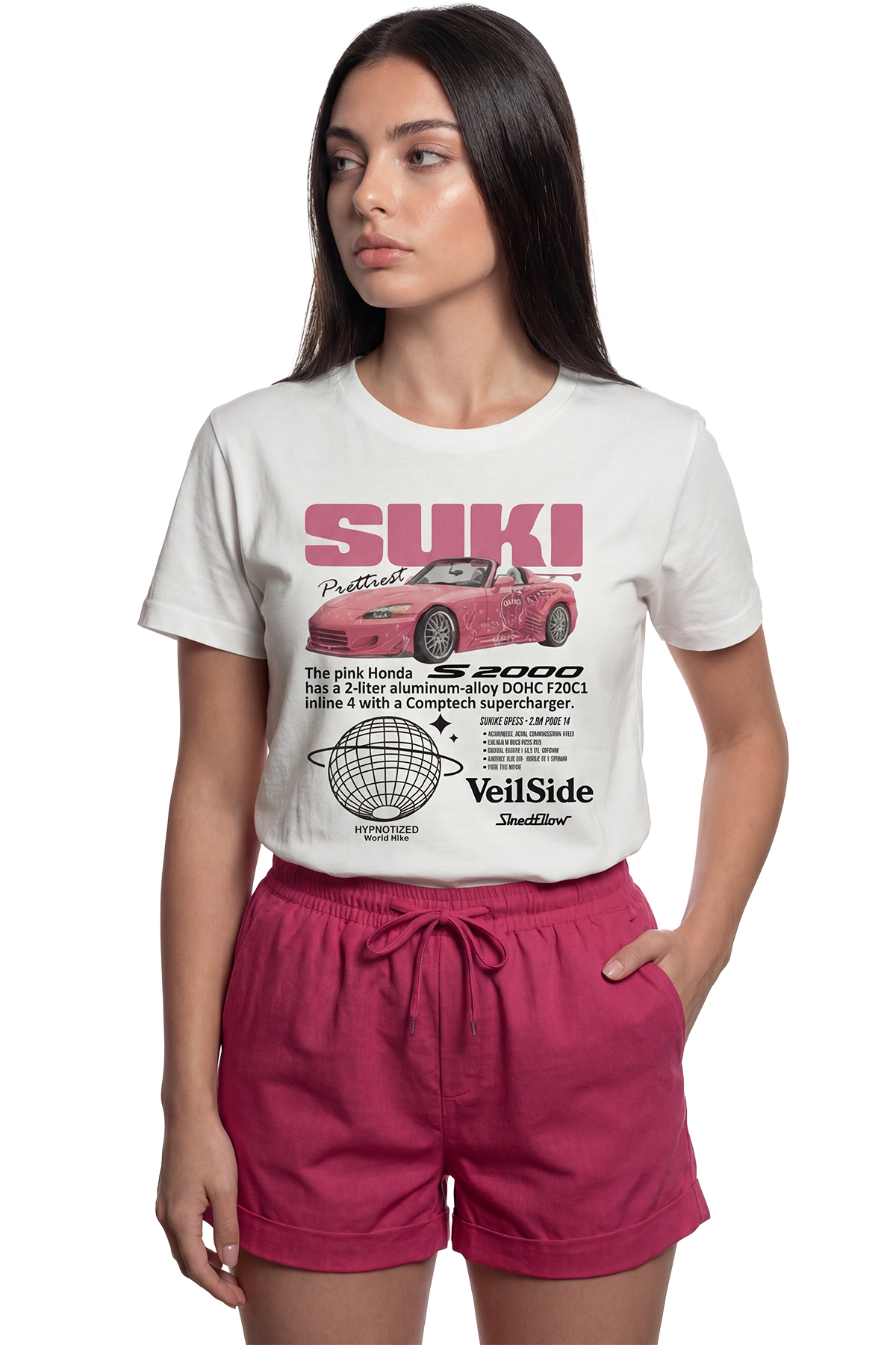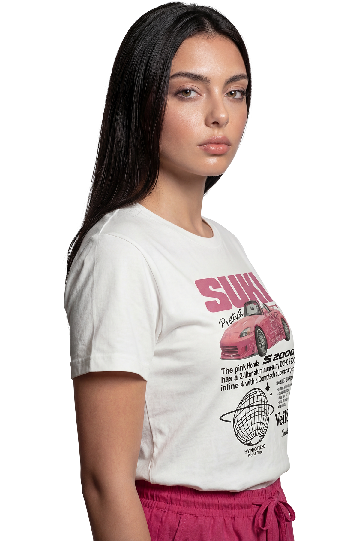 ''Suki S2000'' Pembe Spor Araba Baskılı %100 Pamuk Rahat Kesim Premium Kadın Tişört
