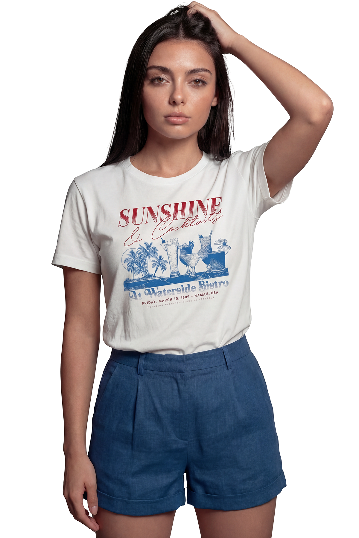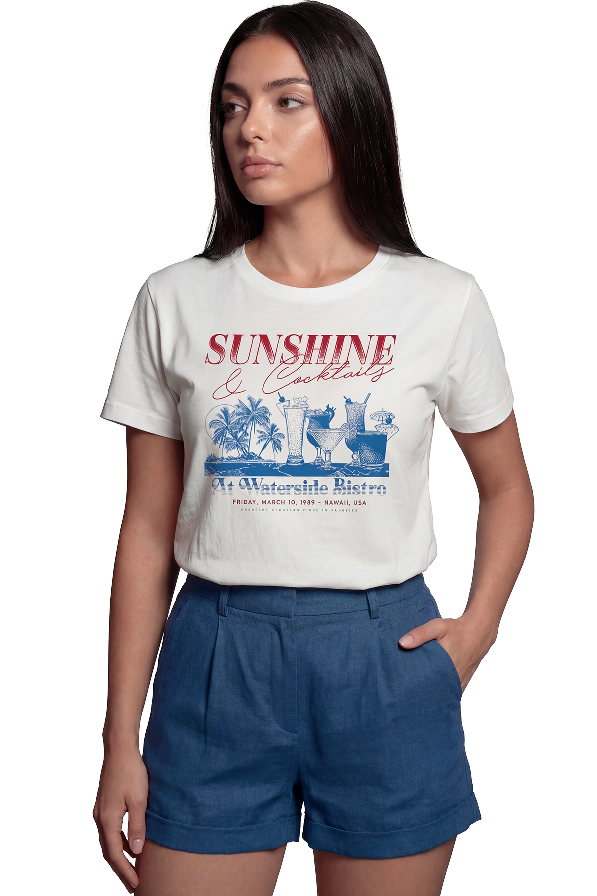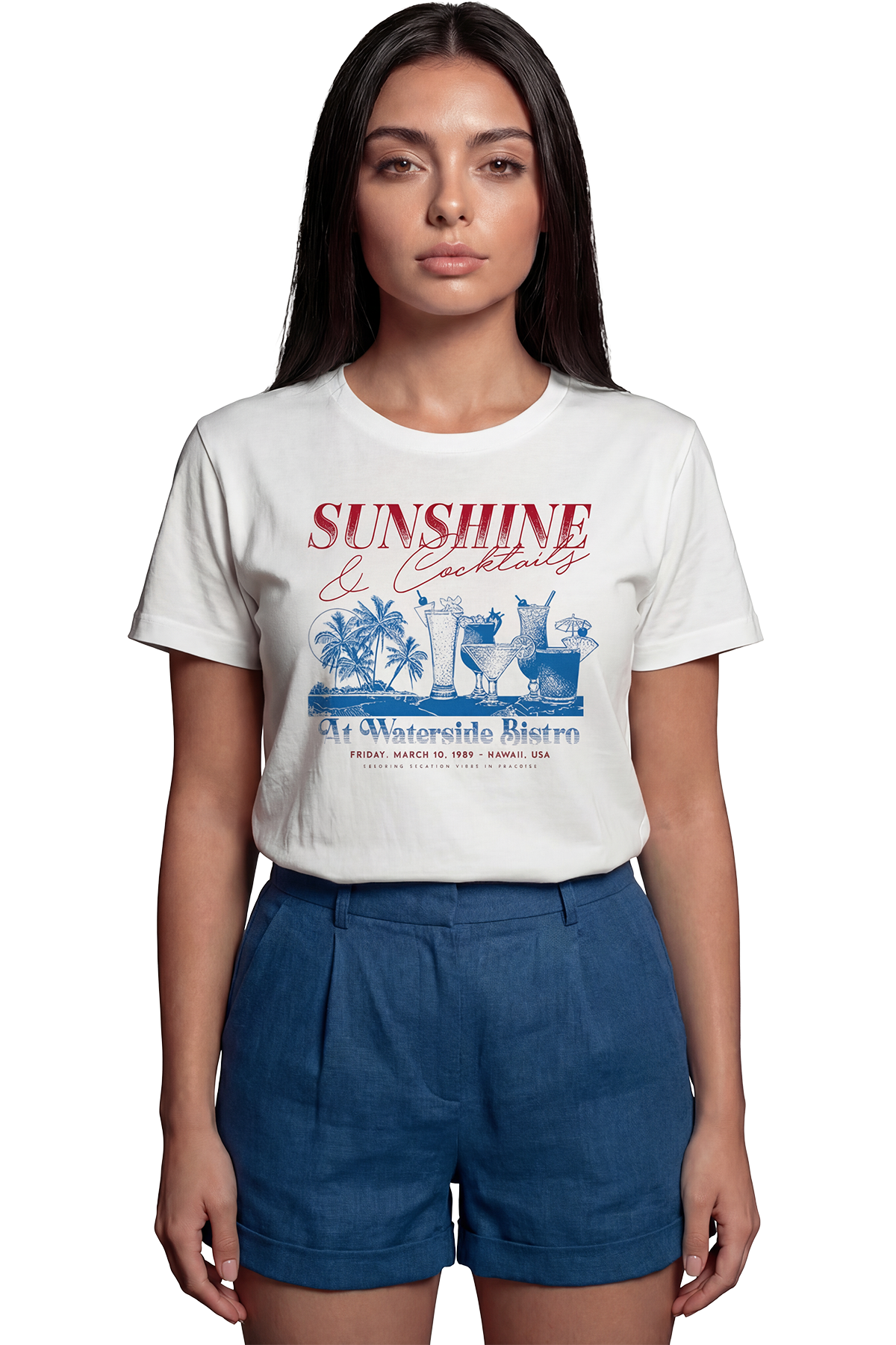 Yaz Güneşi ve Kokteyl Saatleri: Retro ve Keyifli Hawaii'nin sıcak esintisini ve 1989 yılının nostaljik ruhunu üzerinizde taşıyın! "Sunshine & Cocktails" sloganı, "Waterside Bistro" detayı ve çeşitli kokteyl illüstrasyonlarıyla tasarlanan bu tişört, vintage tatil posterlerini andıran keyifli bir estetik sunuyor. Kırmızı ve mavi tonlarının beyaz zemin üzerindeki uyumu, yaz neşesini ve bistro şıklığını yansıtıyor.