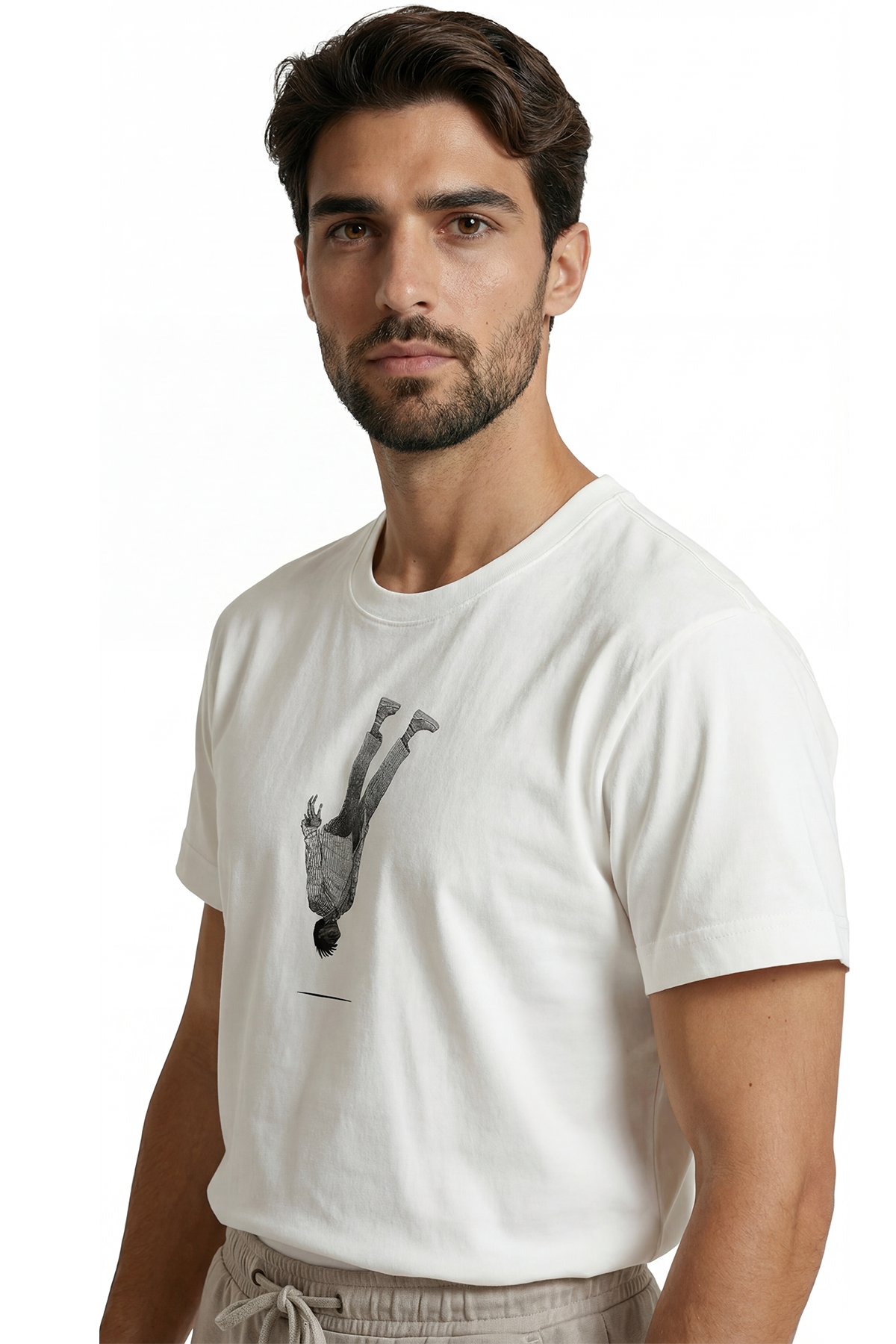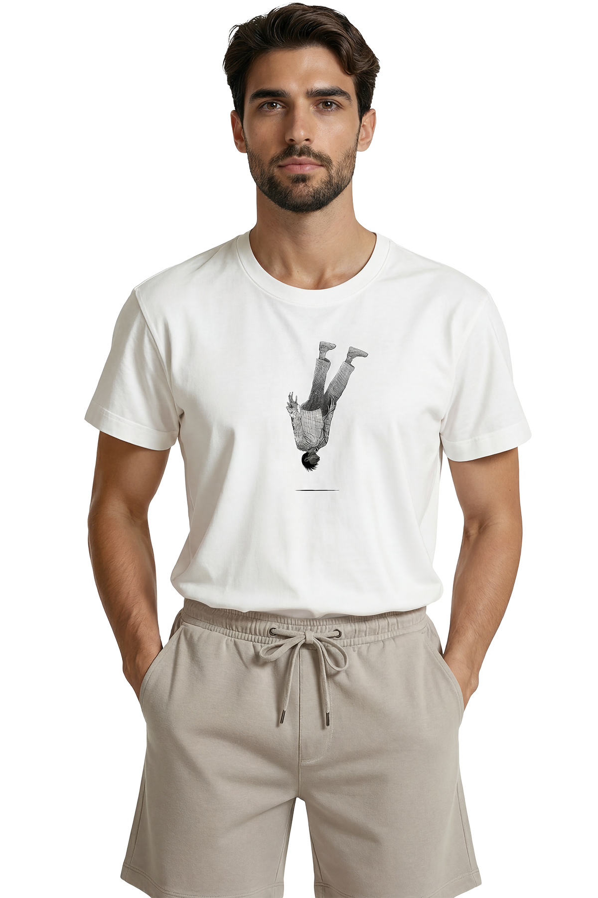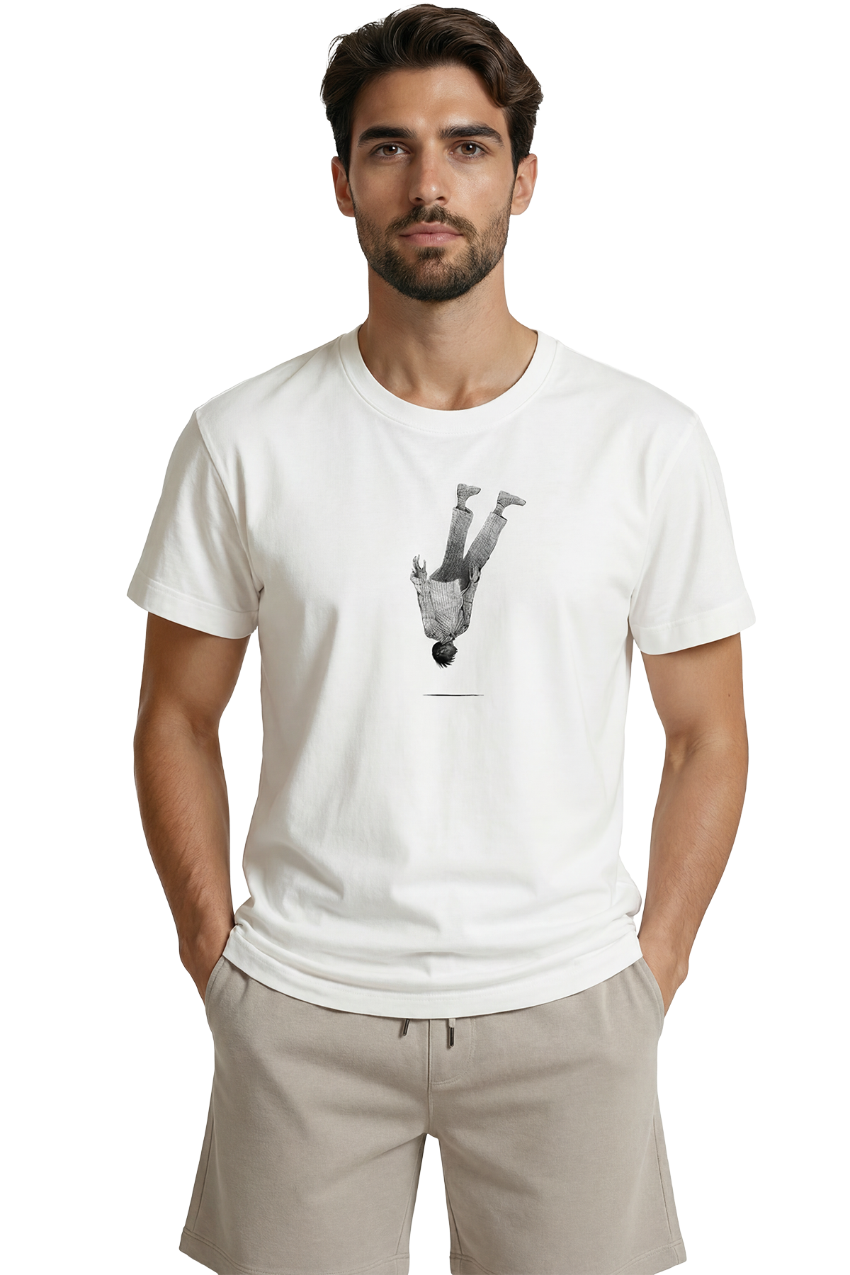 Bazen yükselmek için önce düşmeyi göze almak gerekir. Sürrealist sanatın büyüleyici etkisiyle tasarlanan bu tişört; boşluğa doğru süzülen "Düşen Adam" figürüyle, teslimiyeti ve özgürleşmeyi simgeliyor. İnce kalem işçiliğiyle (etching) çizilmiş gibi duran bu minimalist tasarım, sadeliğin içindeki derinliği görebilen erkekler için tasarlandı. Hem felsefi bir duruş hem de sanatsal bir stil arayanlar için eşsiz bir parça.
