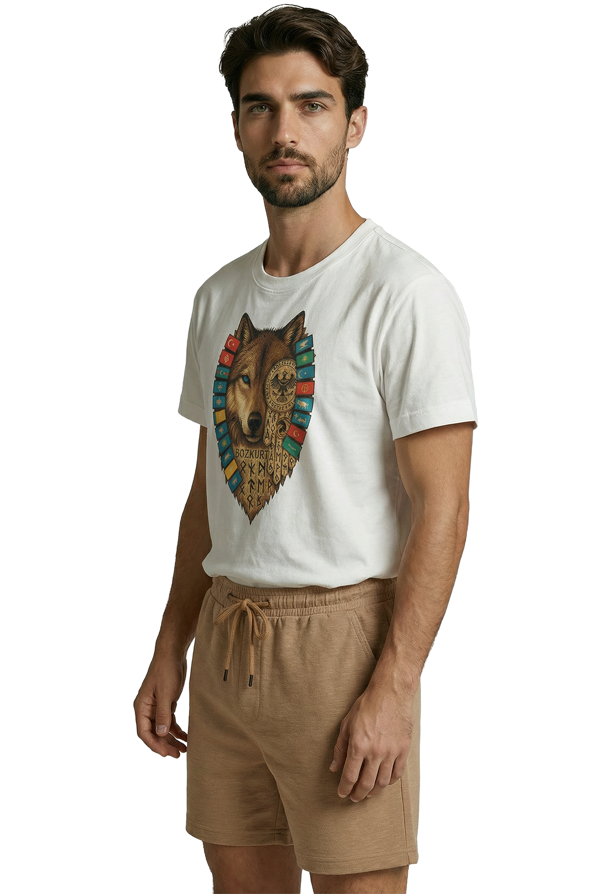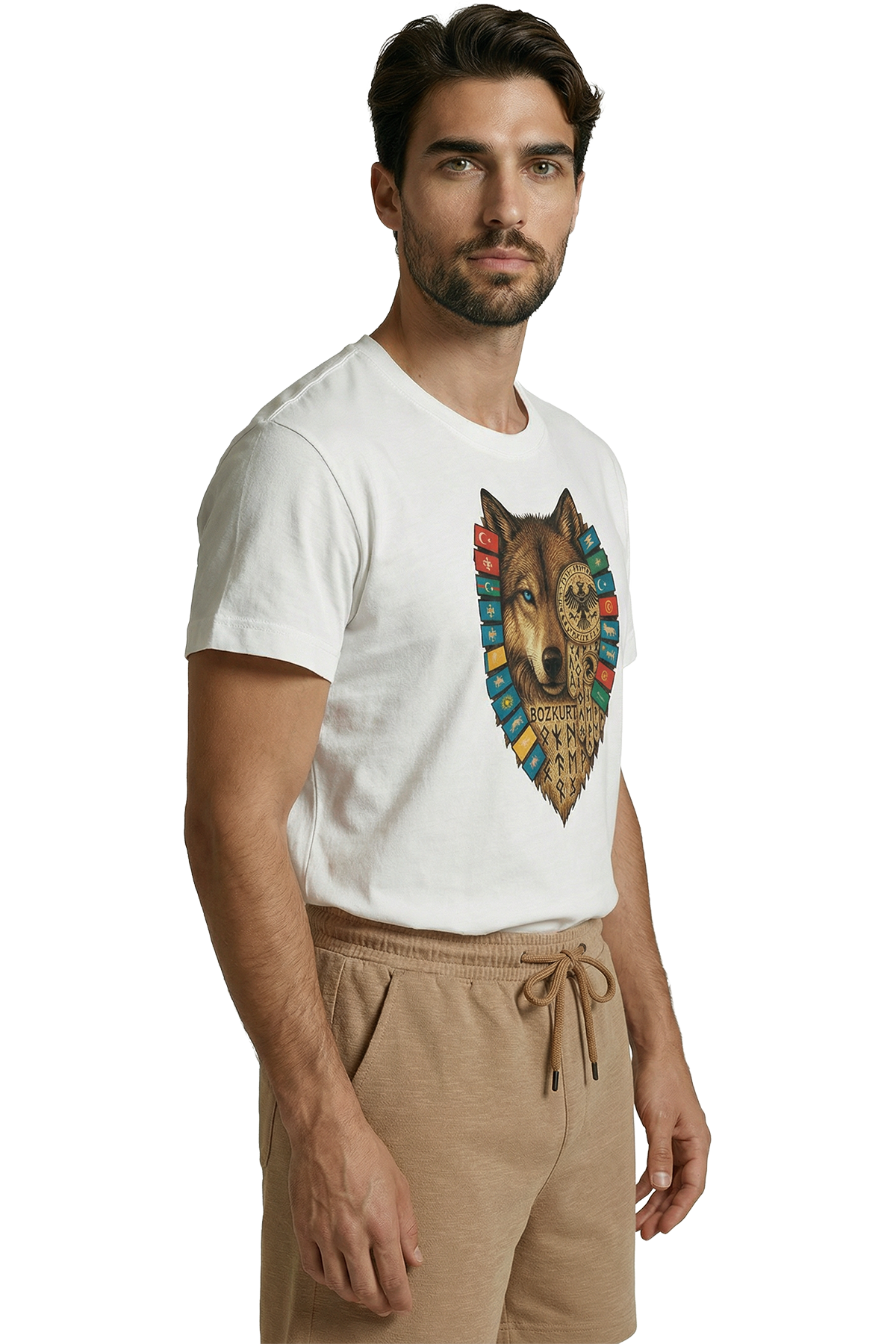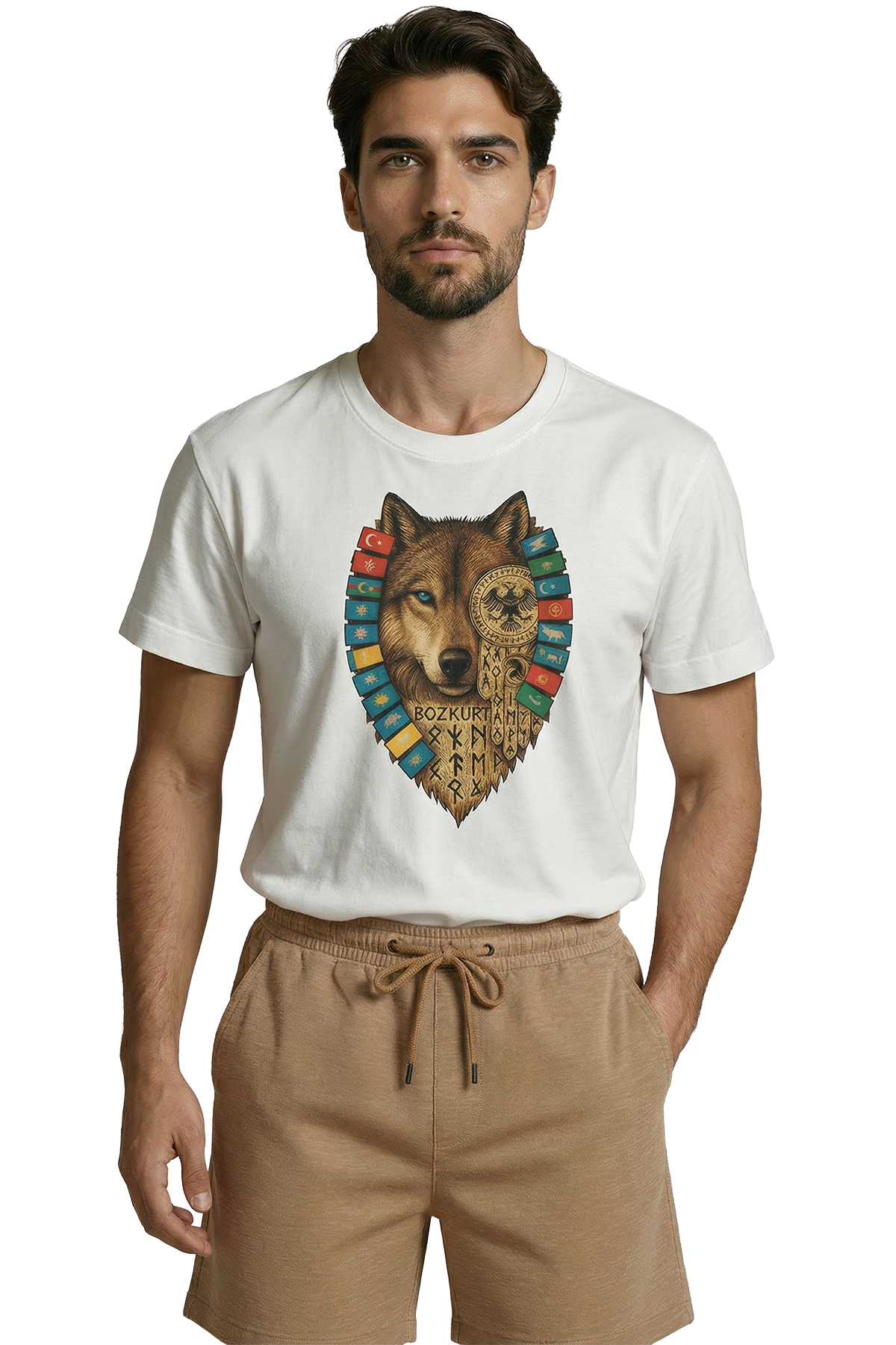 Türk mitolojisinin efsanevi rehberi Gökbörü (Bozkurt), Türk dünyasının birliğini temsil eden bayraklar ve tarihimizin köklerine inen Göktürkçe motifler... Bu tasarım, sadece bir tişört değil; köklü bir tarihin ve sarsılmaz bir duruşun simgesidir. Mavi gözlü kurdun keskin bakışları ve detaylı çizimiyle hayat bulan bu eser, milli duygularını ve tarih bilincini stiline yansıtmak isteyen erkekler için özel olarak tasarlandı.