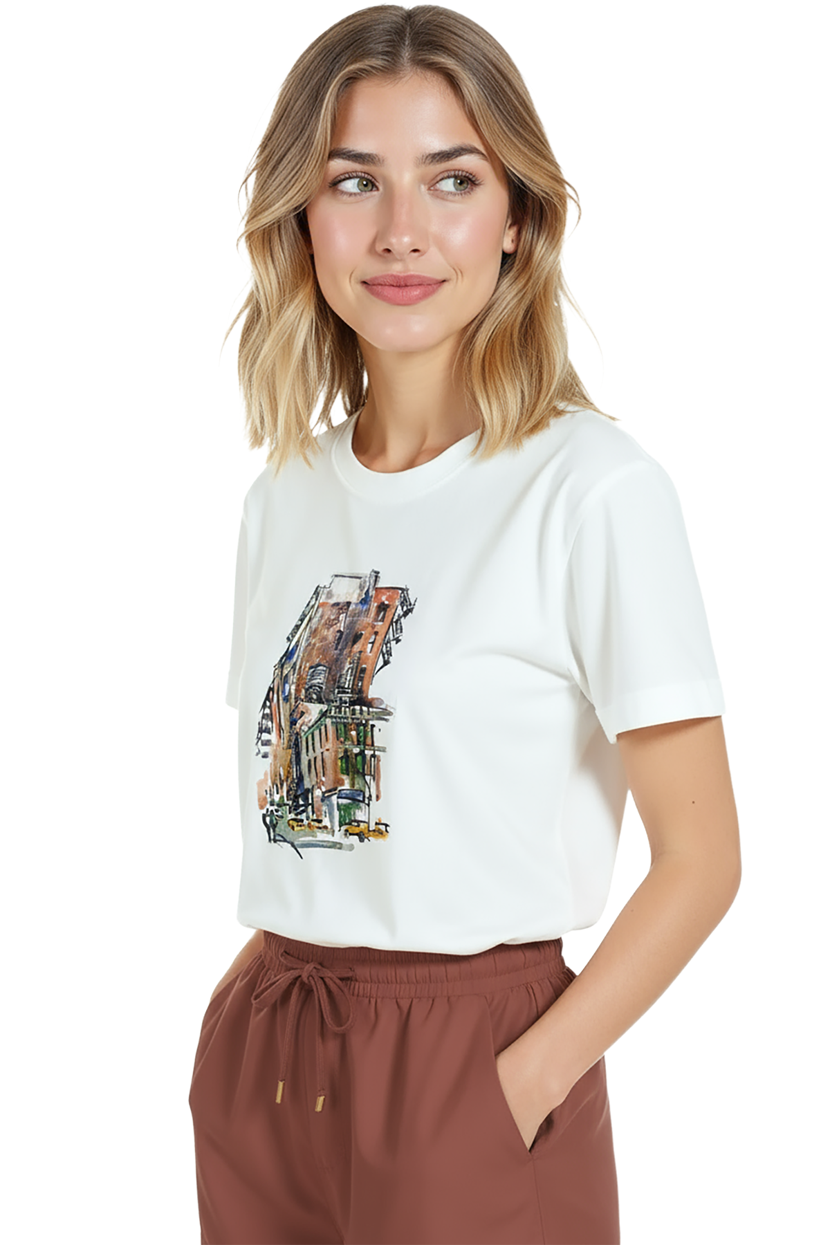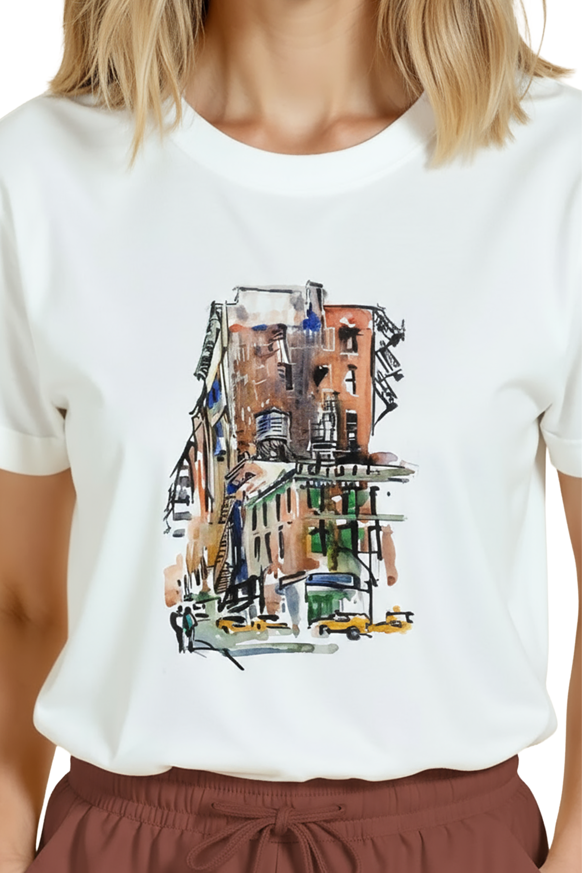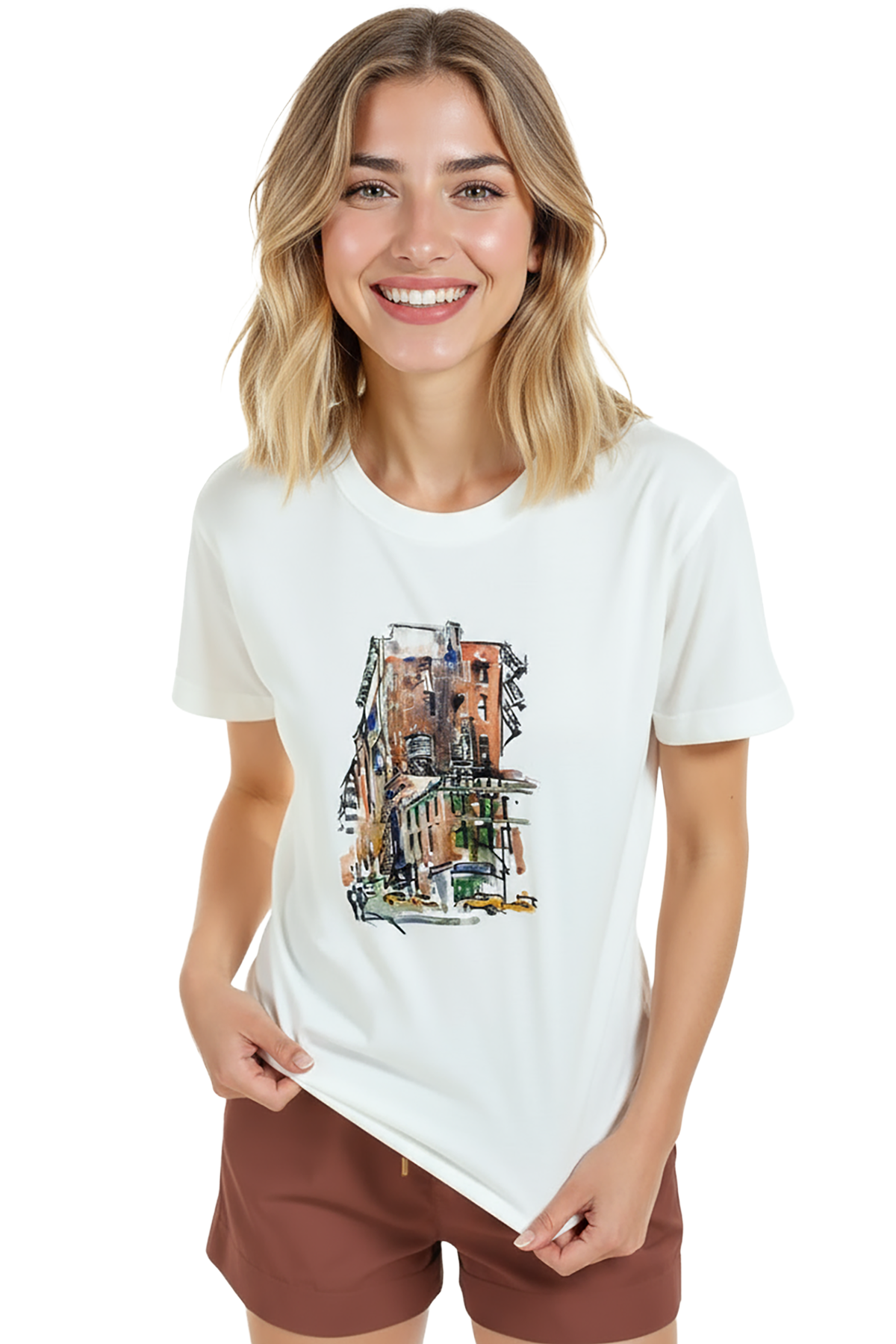 Şehir dokusunu ve günlük yaşamın hareketini yansıtan kadın tişörtü. Bu beyaz relaxed fit (kadın kesim) tişörtün göğüs ortasında yer alan suluboya ve karakalem karışımı şehir köşesi illüstrasyonu; bina cepheleri, su deposu, taksi siluetleri ve ince perspektif çizgileriyle hem canlı hem atmosferik bir kompozisyon sunar. Ürün %100 pamuk olup relaxed fit kesimi sayesinde gün boyu yumuşaklık, nefes alabilirlik ve özgür hareket sağlar. Desen yüksek çözünürlüklü dijital baskı ile uygulanmıştır; suluboya geçişleri ve karakalem detayları uzun süre canlı kalacak şekilde bastırılmıştır. Günlük şehir kombinleri, kafe‑stili ve minimal‑sanatsal gardıroplar için ideal, hikâye odaklı bir parça.