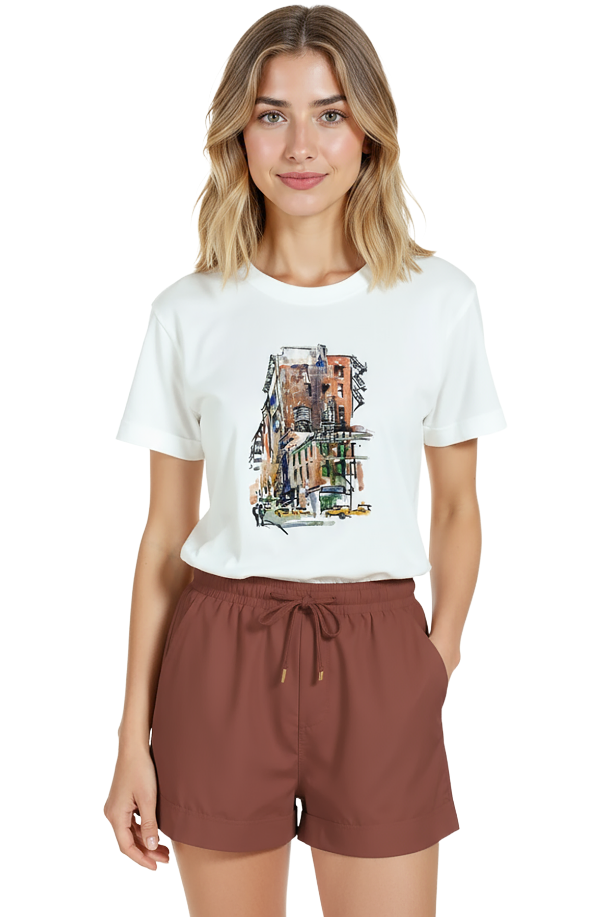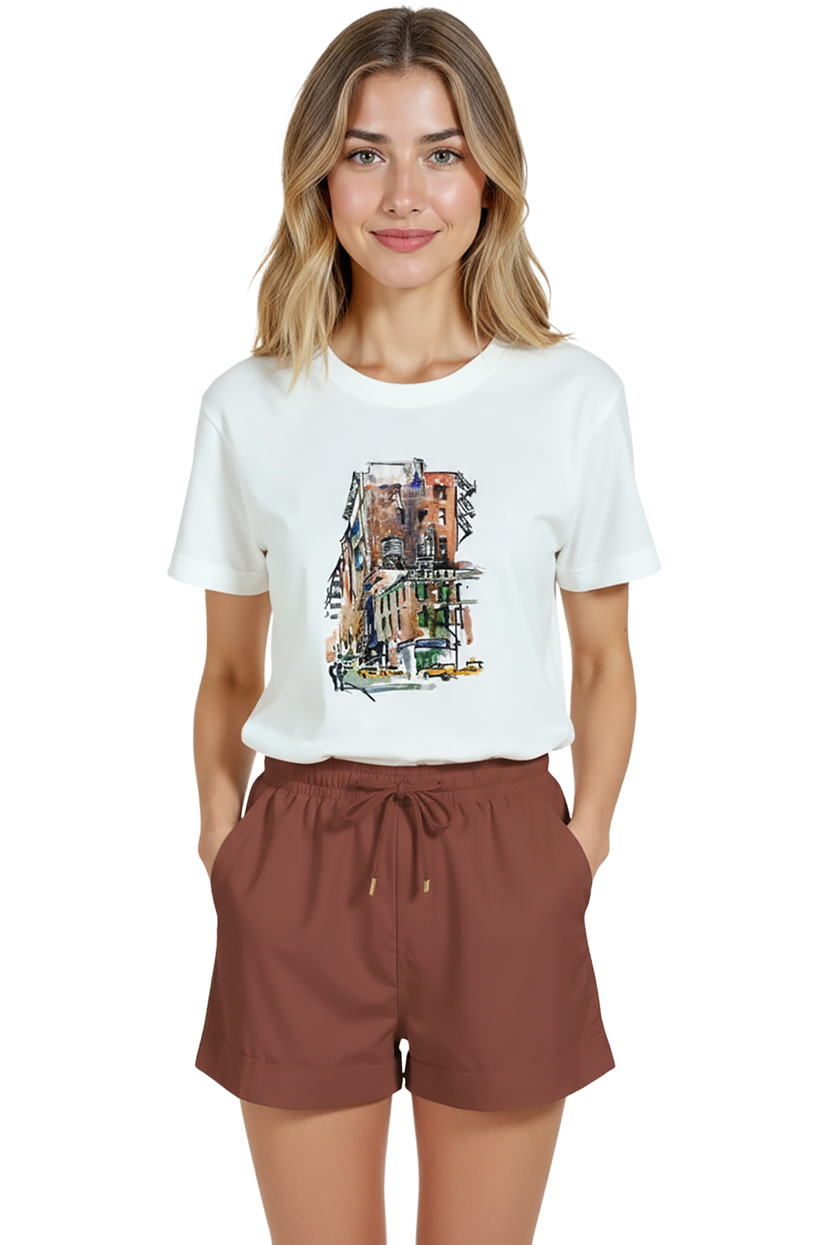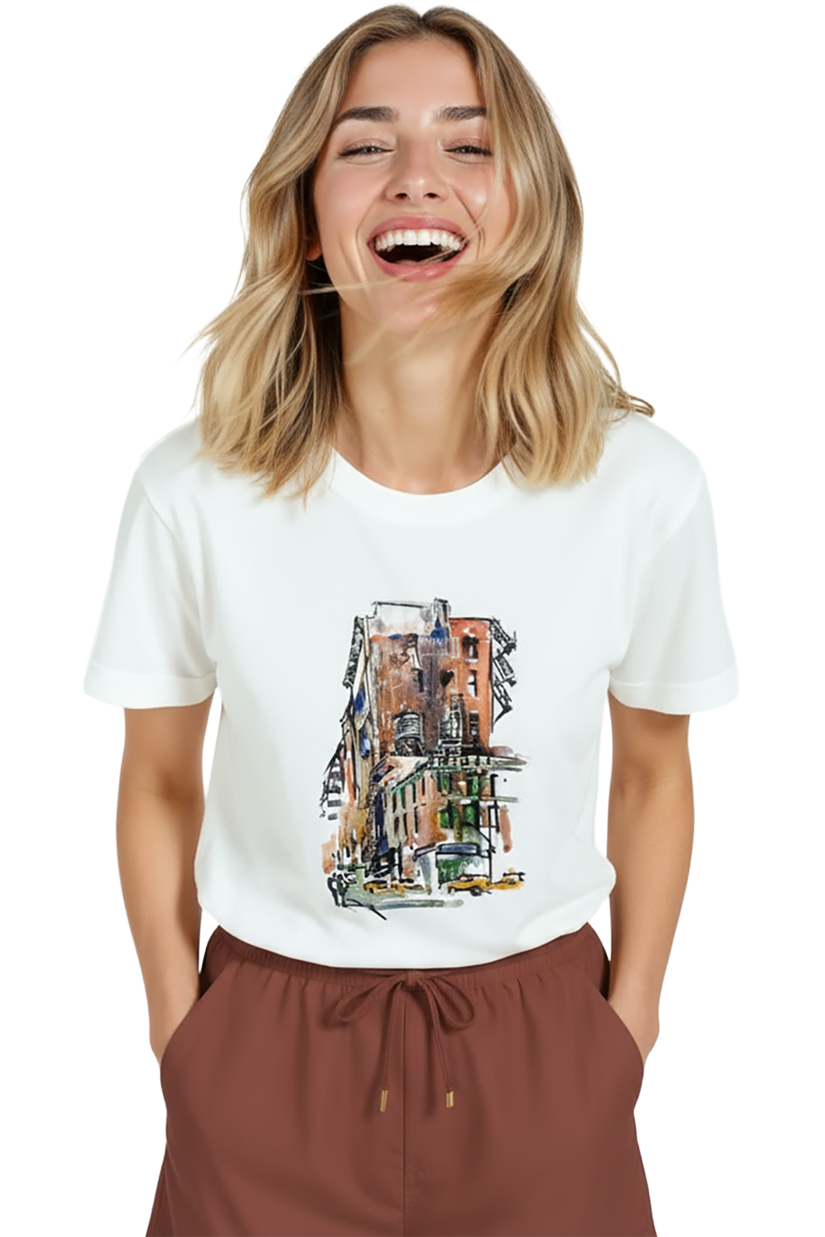 Şehir dokusunu ve günlük yaşamın hareketini yansıtan kadın tişörtü. Bu beyaz relaxed fit (kadın kesim) tişörtün göğüs ortasında yer alan suluboya ve karakalem karışımı şehir köşesi illüstrasyonu; bina cepheleri, su deposu, taksi siluetleri ve ince perspektif çizgileriyle hem canlı hem atmosferik bir kompozisyon sunar. Ürün %100 pamuk olup relaxed fit kesimi sayesinde gün boyu yumuşaklık, nefes alabilirlik ve özgür hareket sağlar. Desen yüksek çözünürlüklü dijital baskı ile uygulanmıştır; suluboya geçişleri ve karakalem detayları uzun süre canlı kalacak şekilde bastırılmıştır. Günlük şehir kombinleri, kafe‑stili ve minimal‑sanatsal gardıroplar için ideal, hikâye odaklı bir parça.