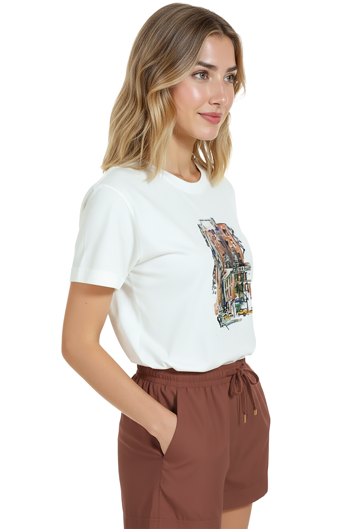 Kadın Beyaz Relaxed Fit %100 Pamuk Tişört – Şehir Köşesi Suluboya Baskılı